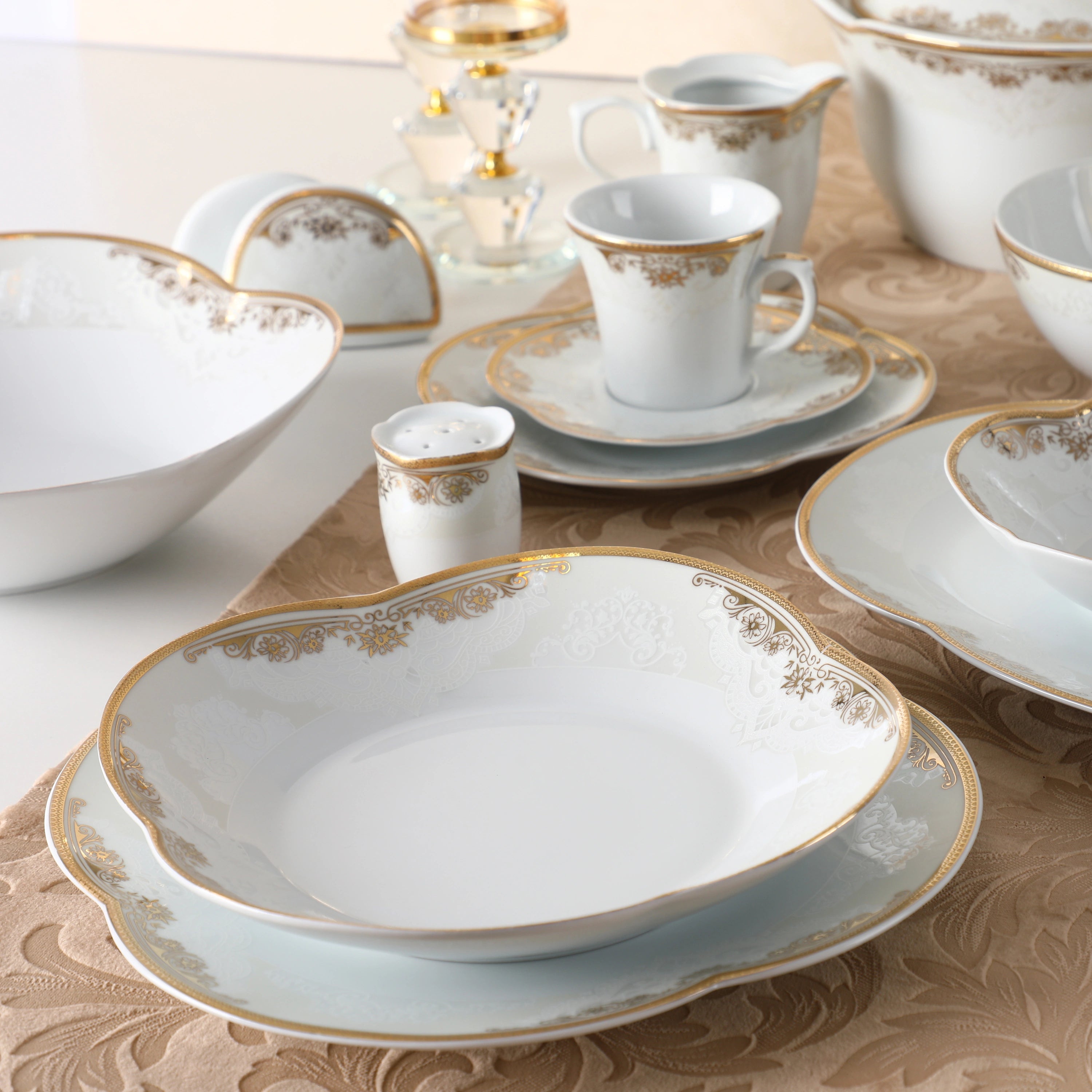 SIX-PERSON 30-PIECE WHITE AND GOLD CLOVER SHAPED DINNERWARE SET