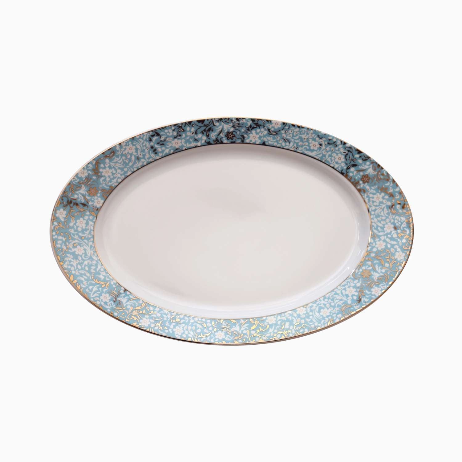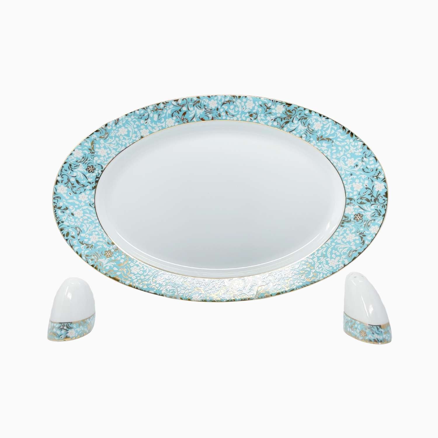 SIX PERSON 30-PIECE BLUE, WHITE, AND GOLD DINNERWARE SET