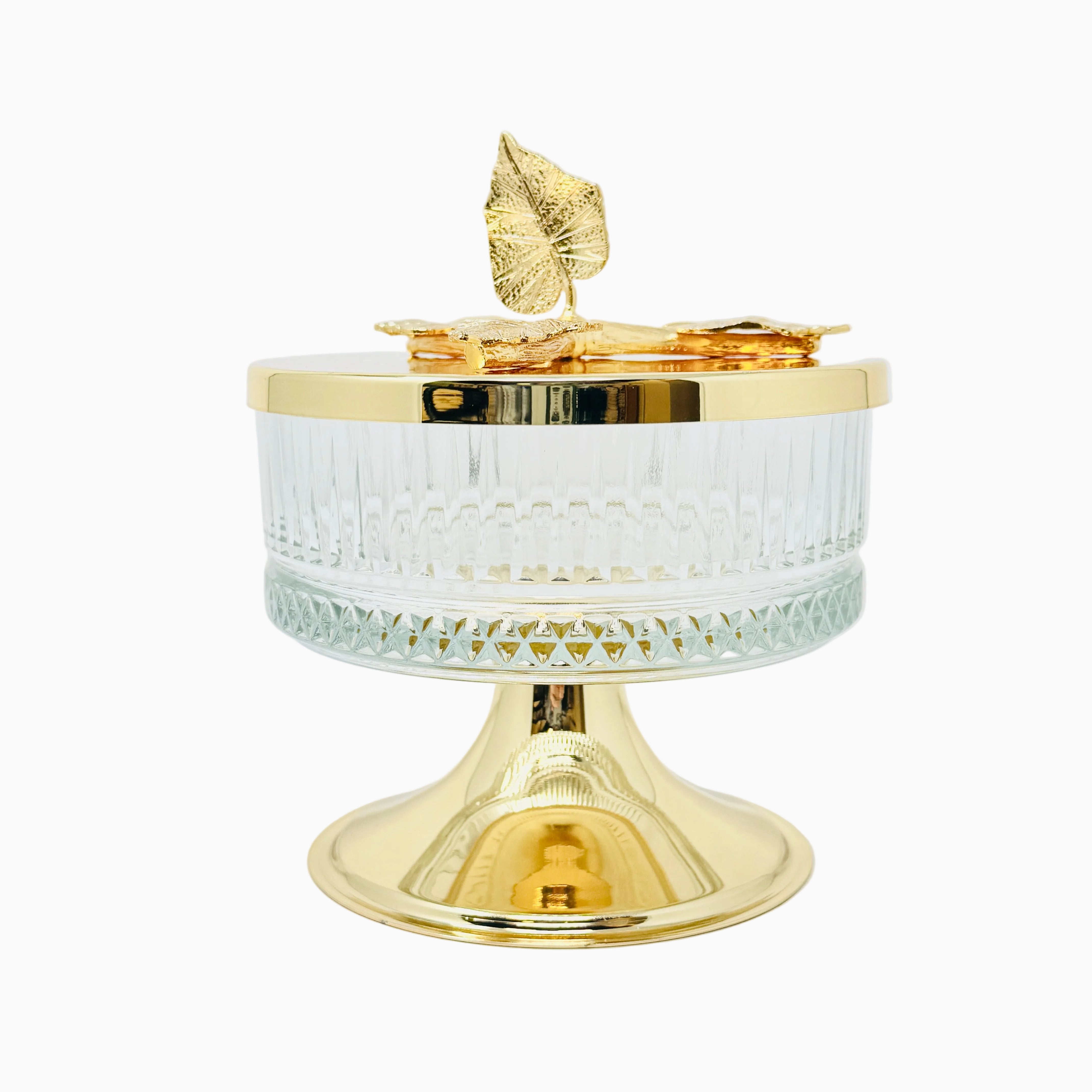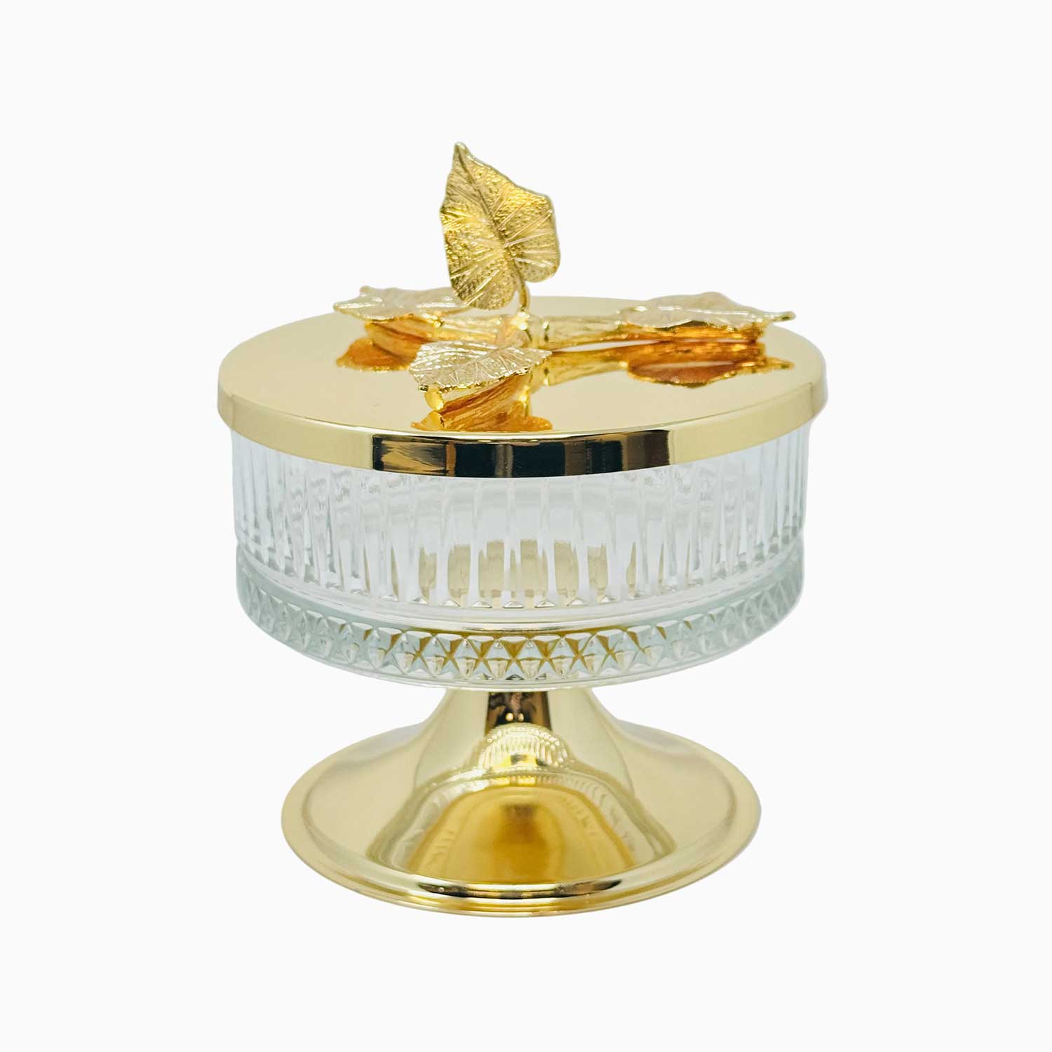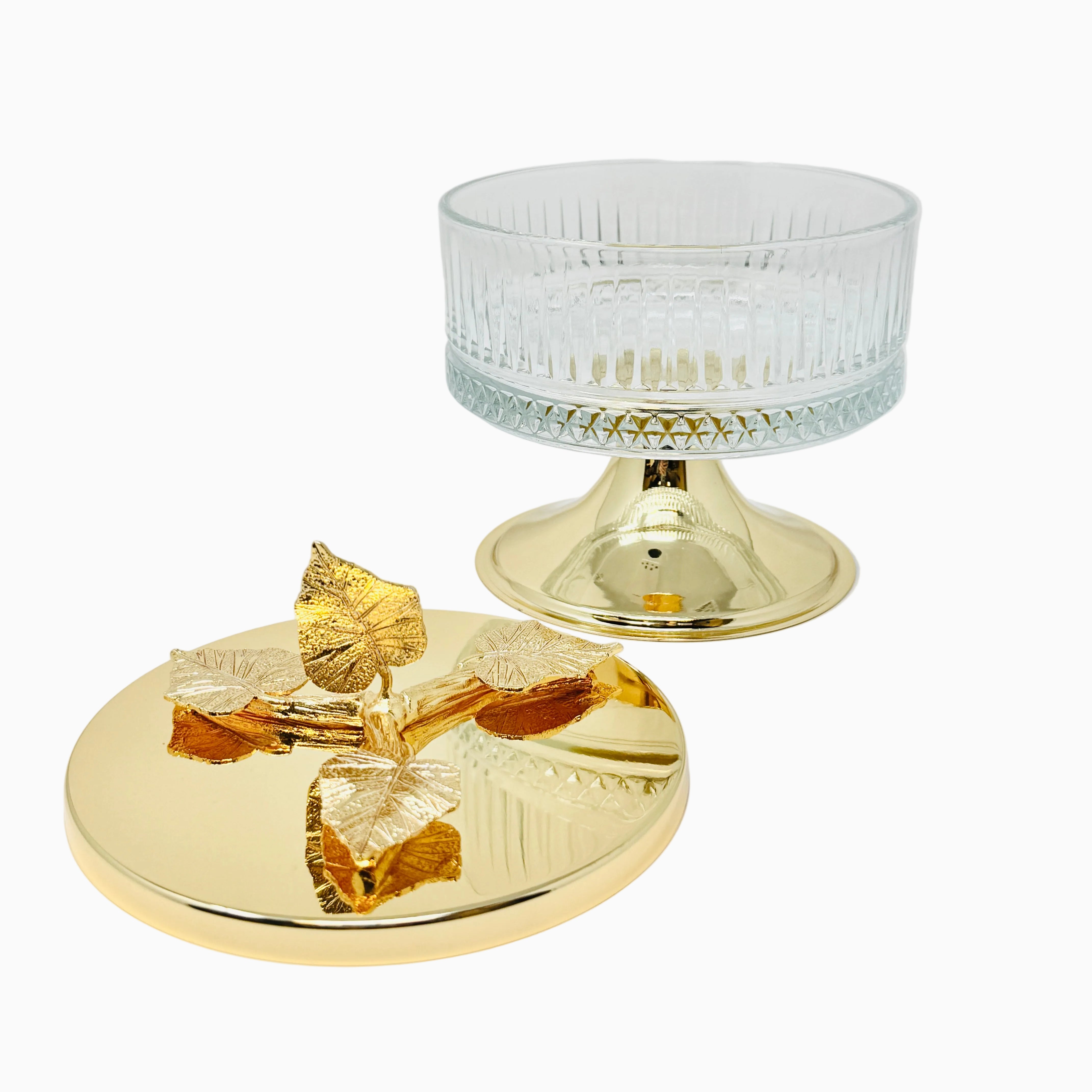 This beautifully crafted Glass Bowl with Golden Tone Leaf Lid is a perfect way to serve sweets and snacks. This piece is also a great addition to any kitchen counter or dining room table. Fill it with fruit or potpourri for an elegant look.