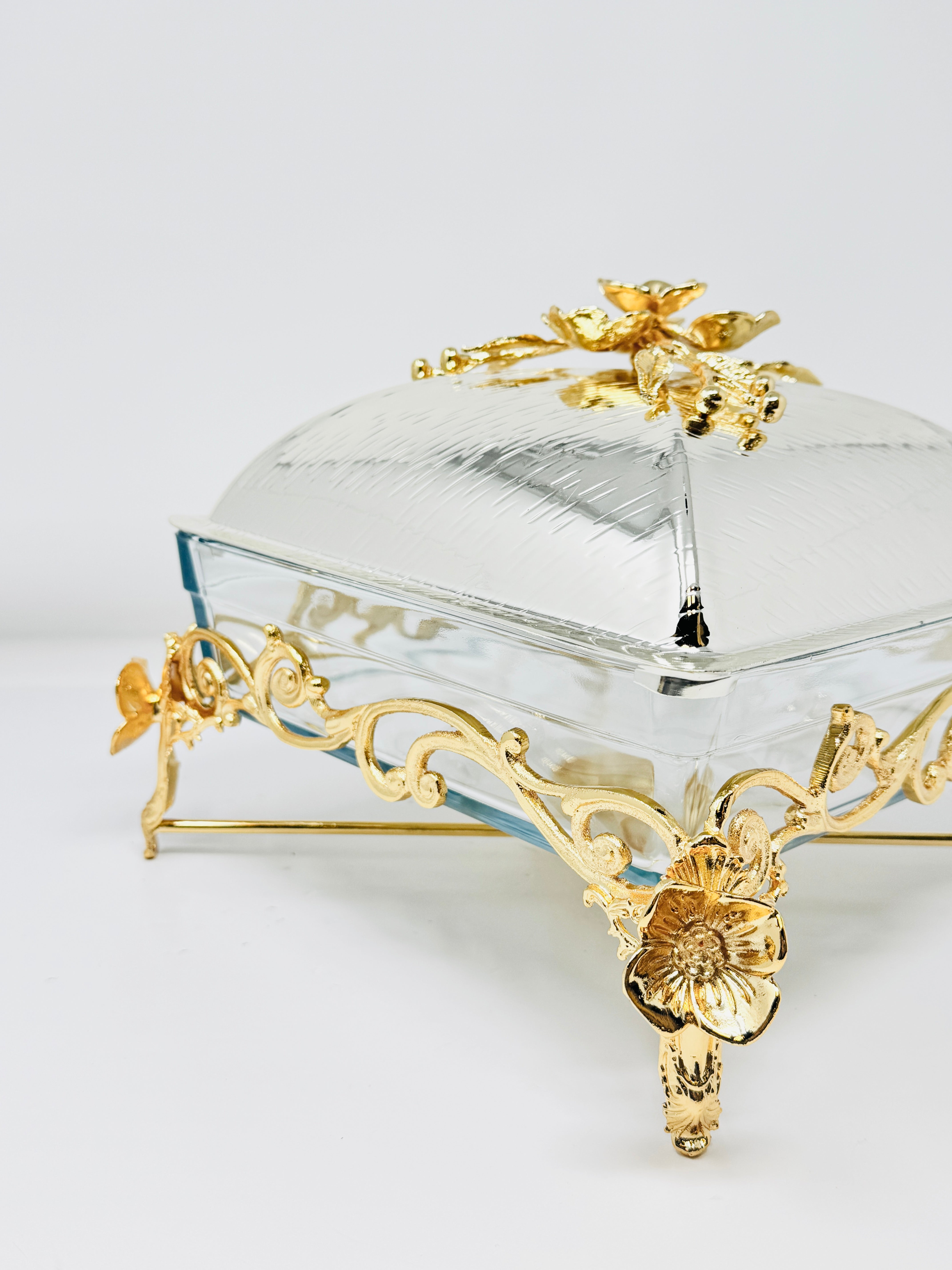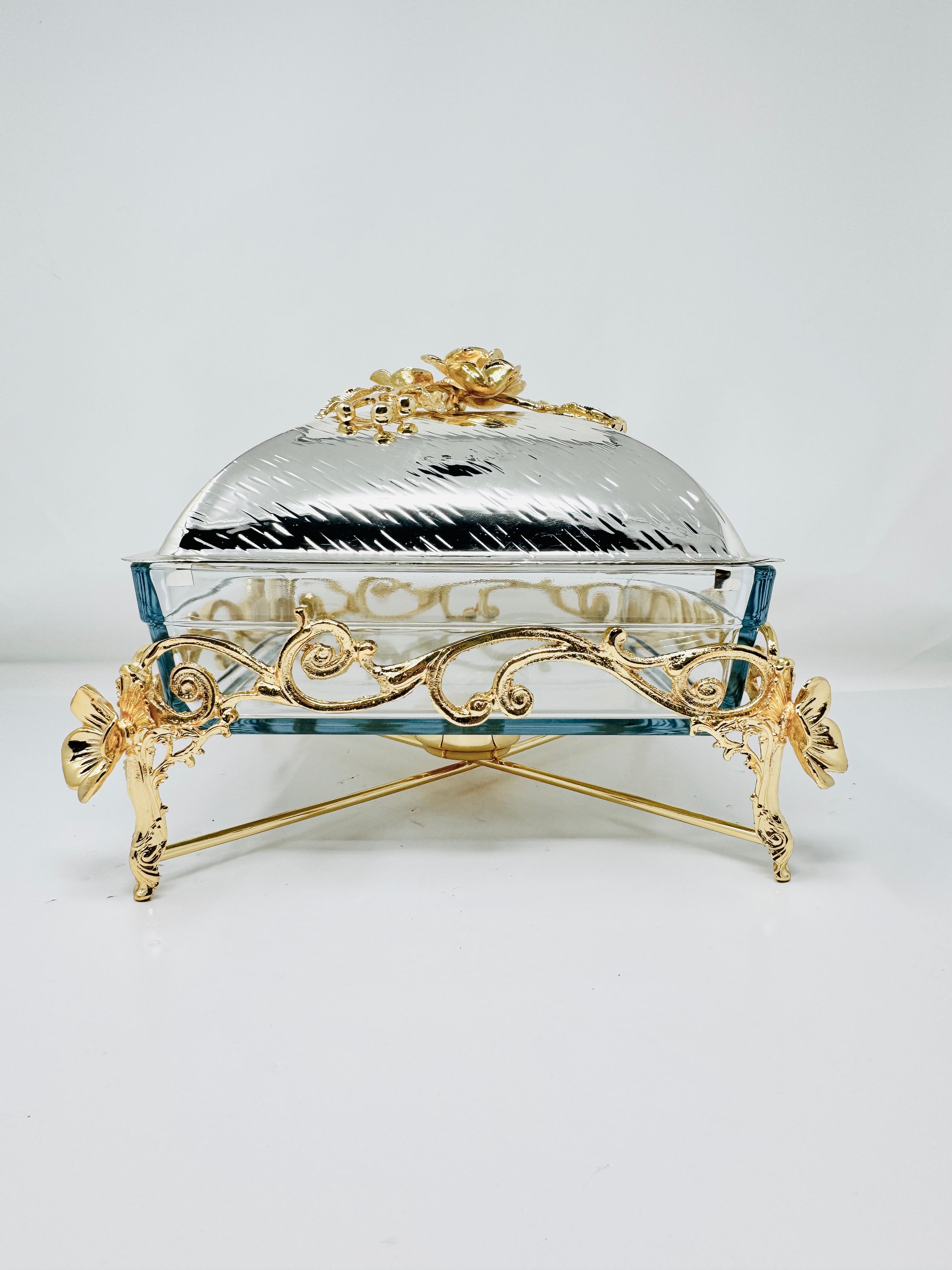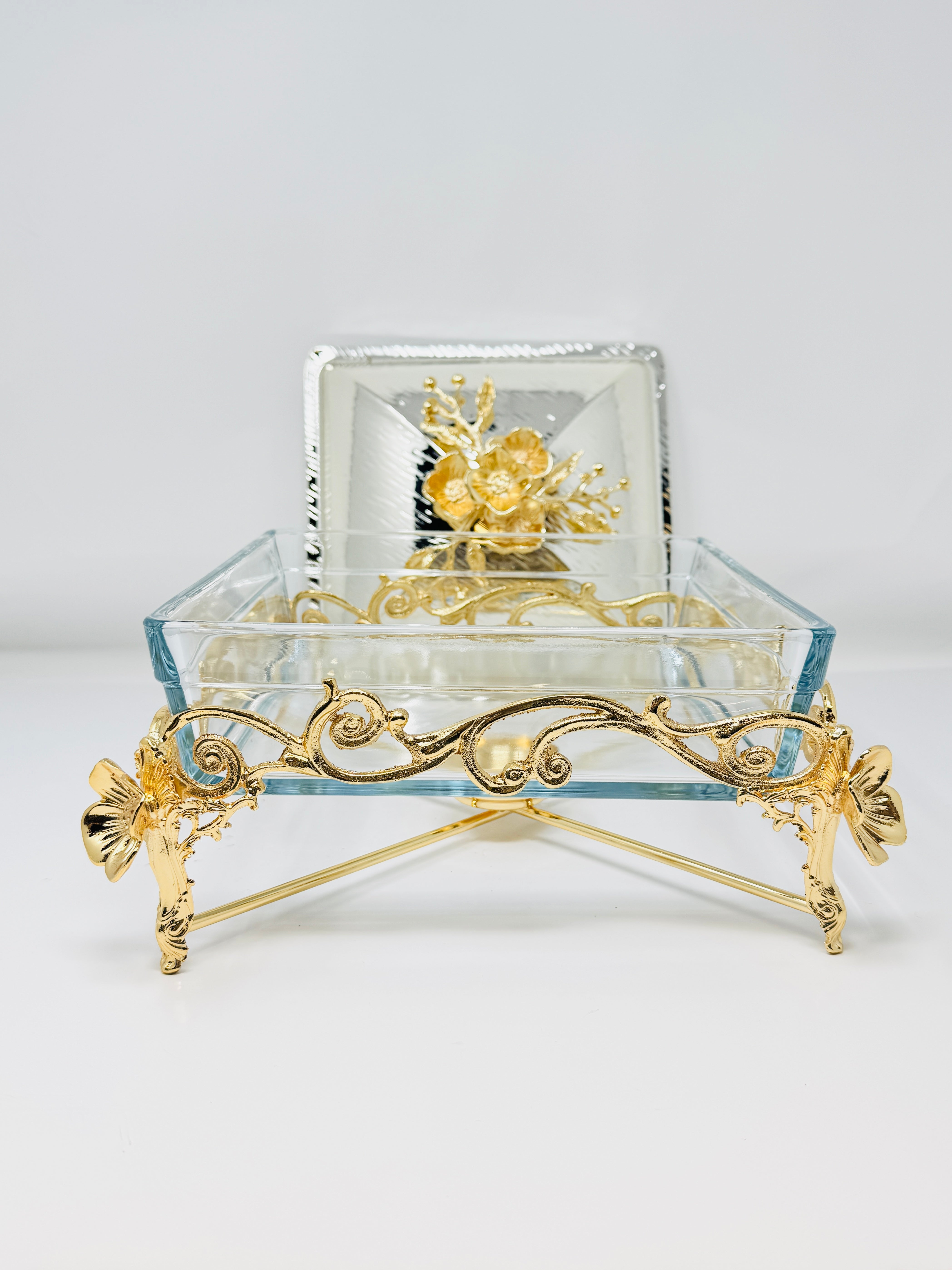 SMALL GOLDEN TONE SQUARE OVENWARE SERVING DISH WITH SILVER LID, ORCHID FLOWER