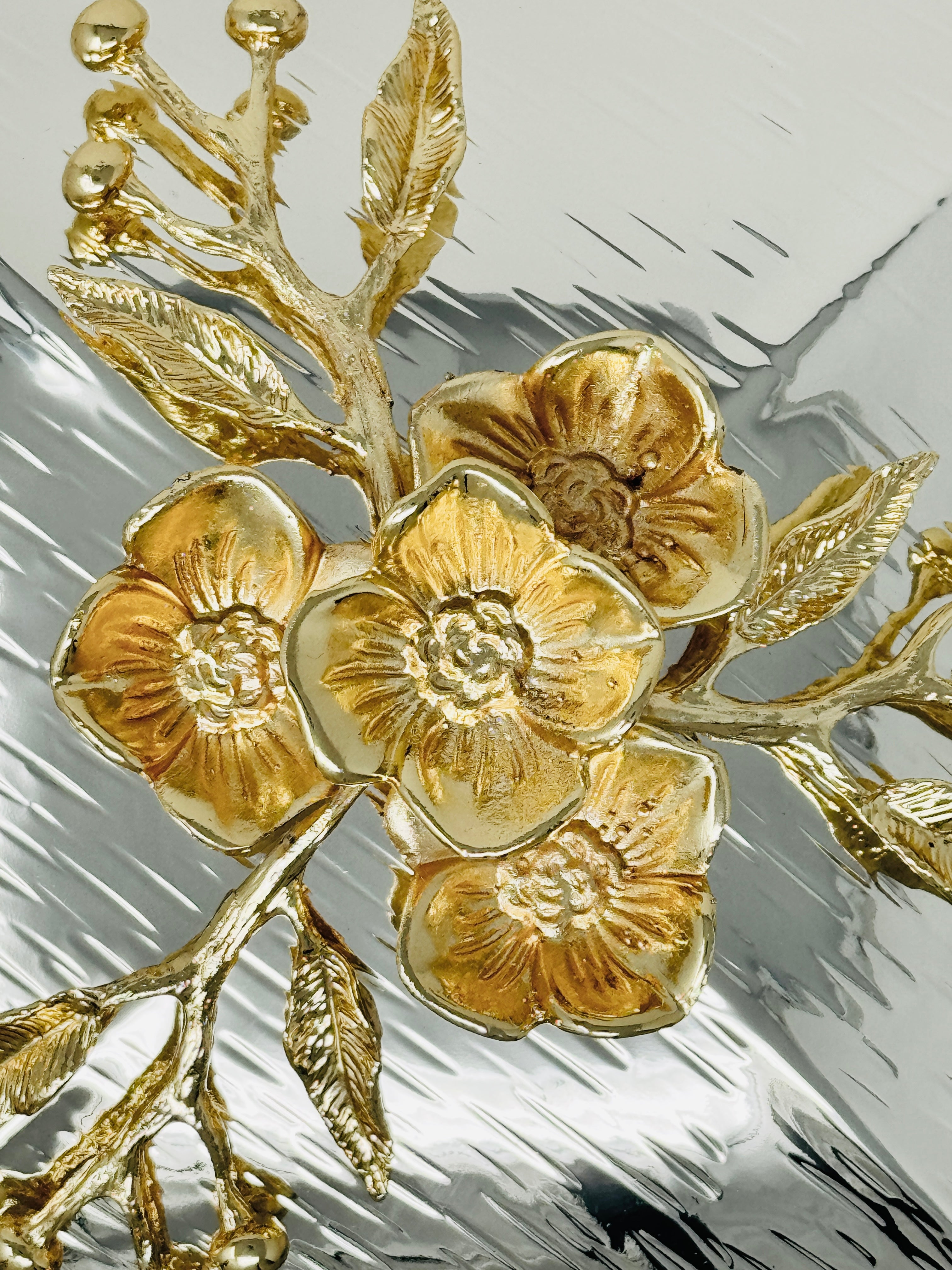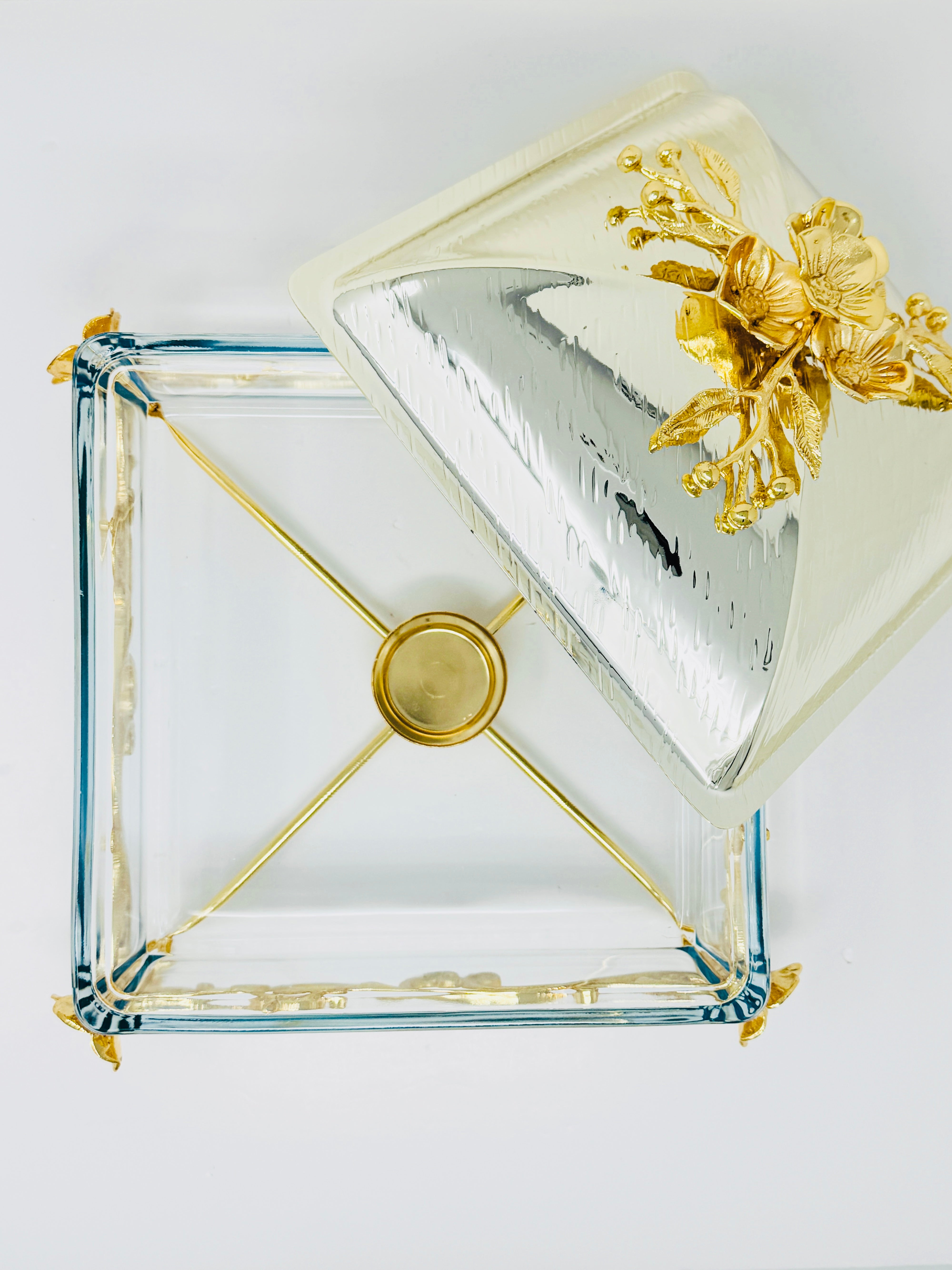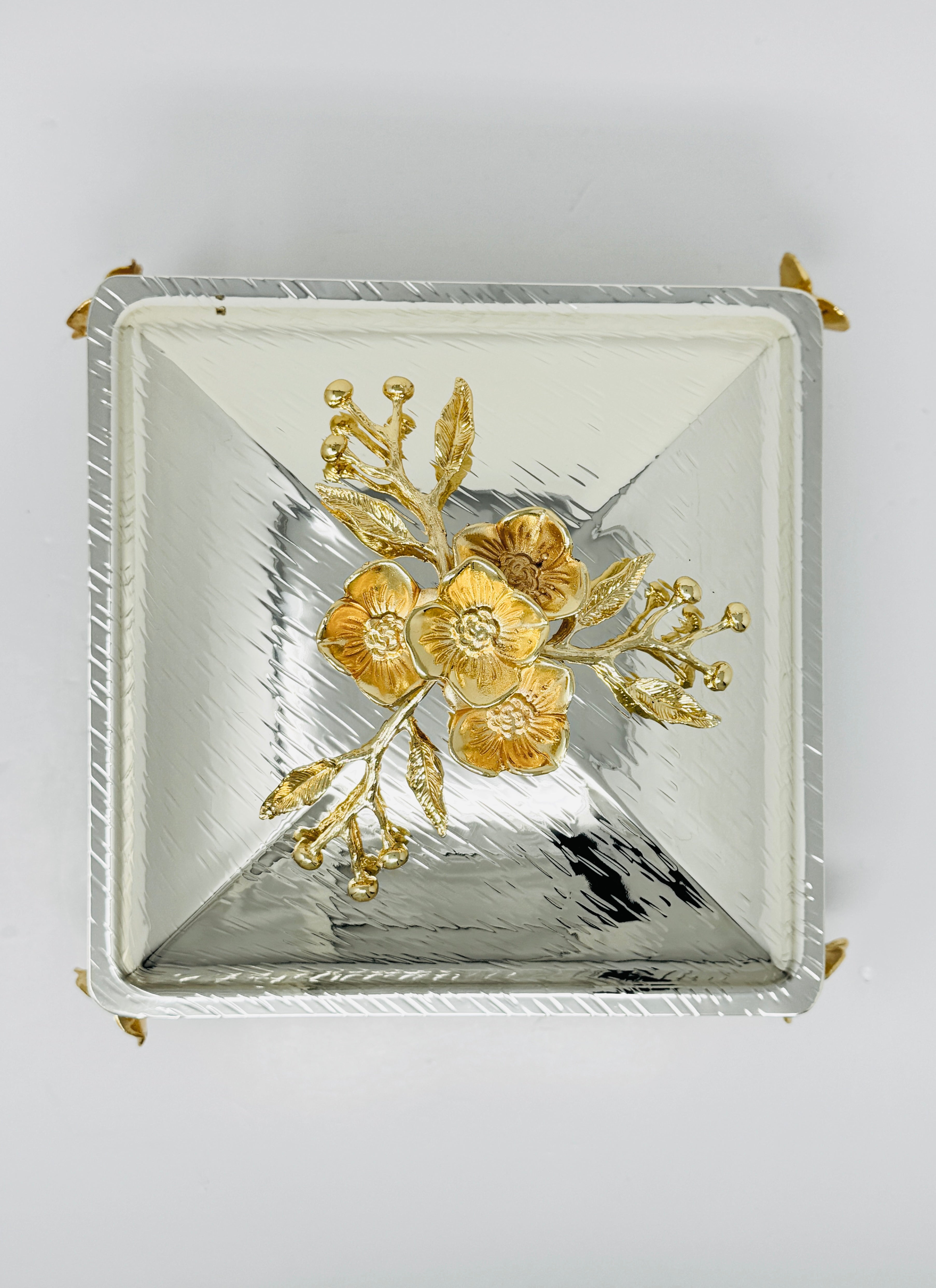 SMALL GOLDEN TONE SQUARE OVENWARE SERVING DISH WITH SILVER LID, ORCHID FLOWER