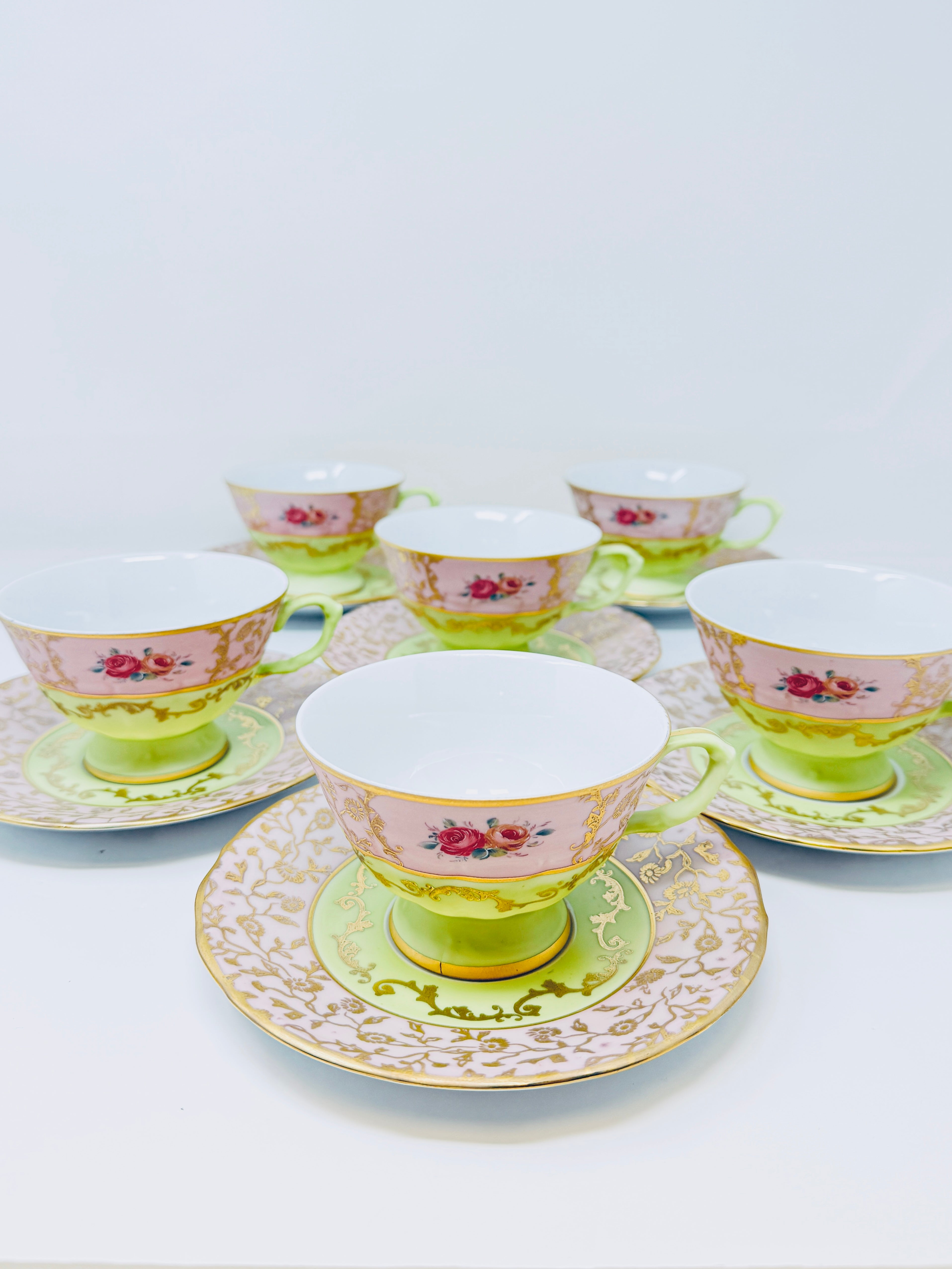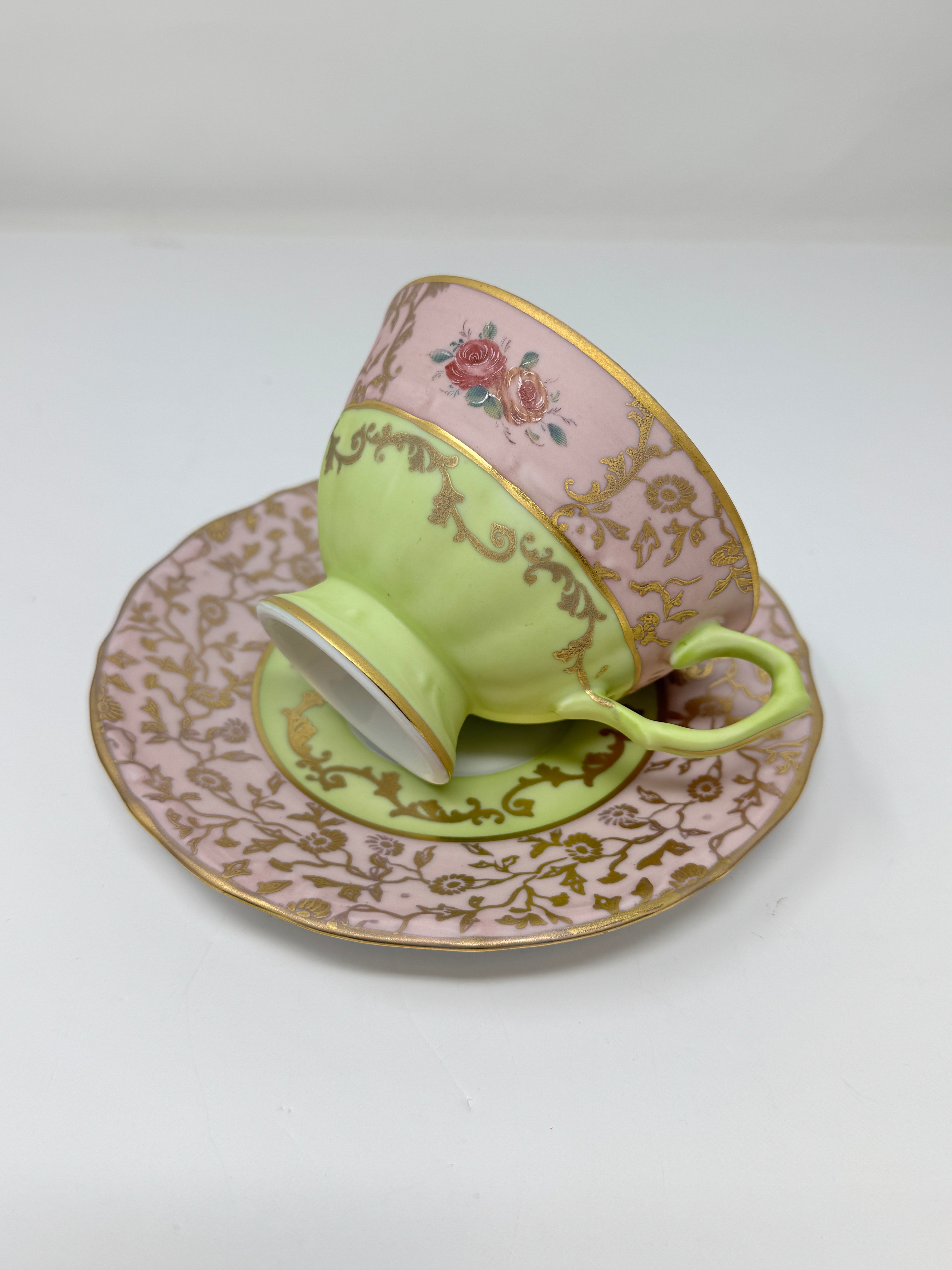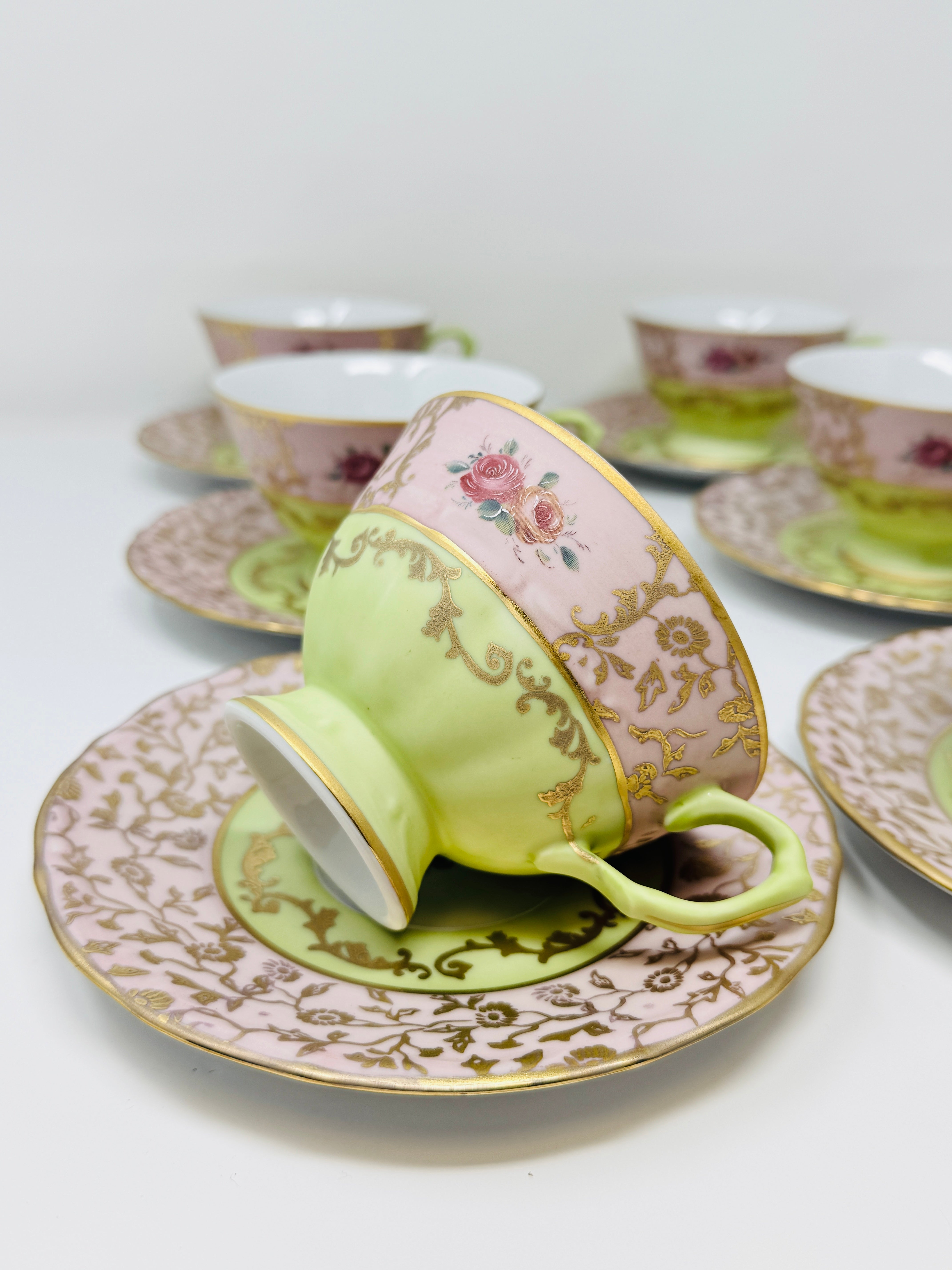 6 PERSON ITALIAN GREEN AND PINK TEA SET