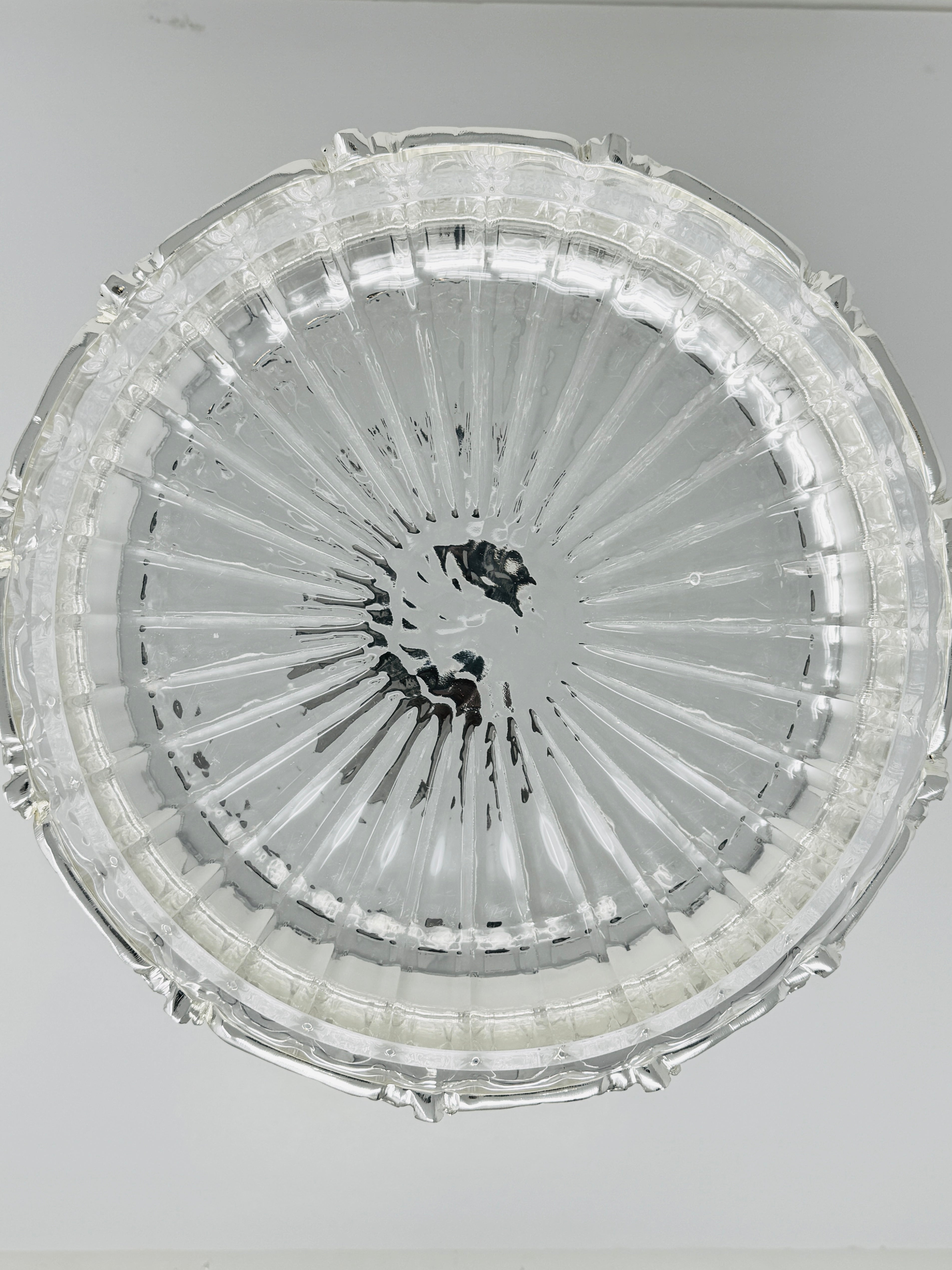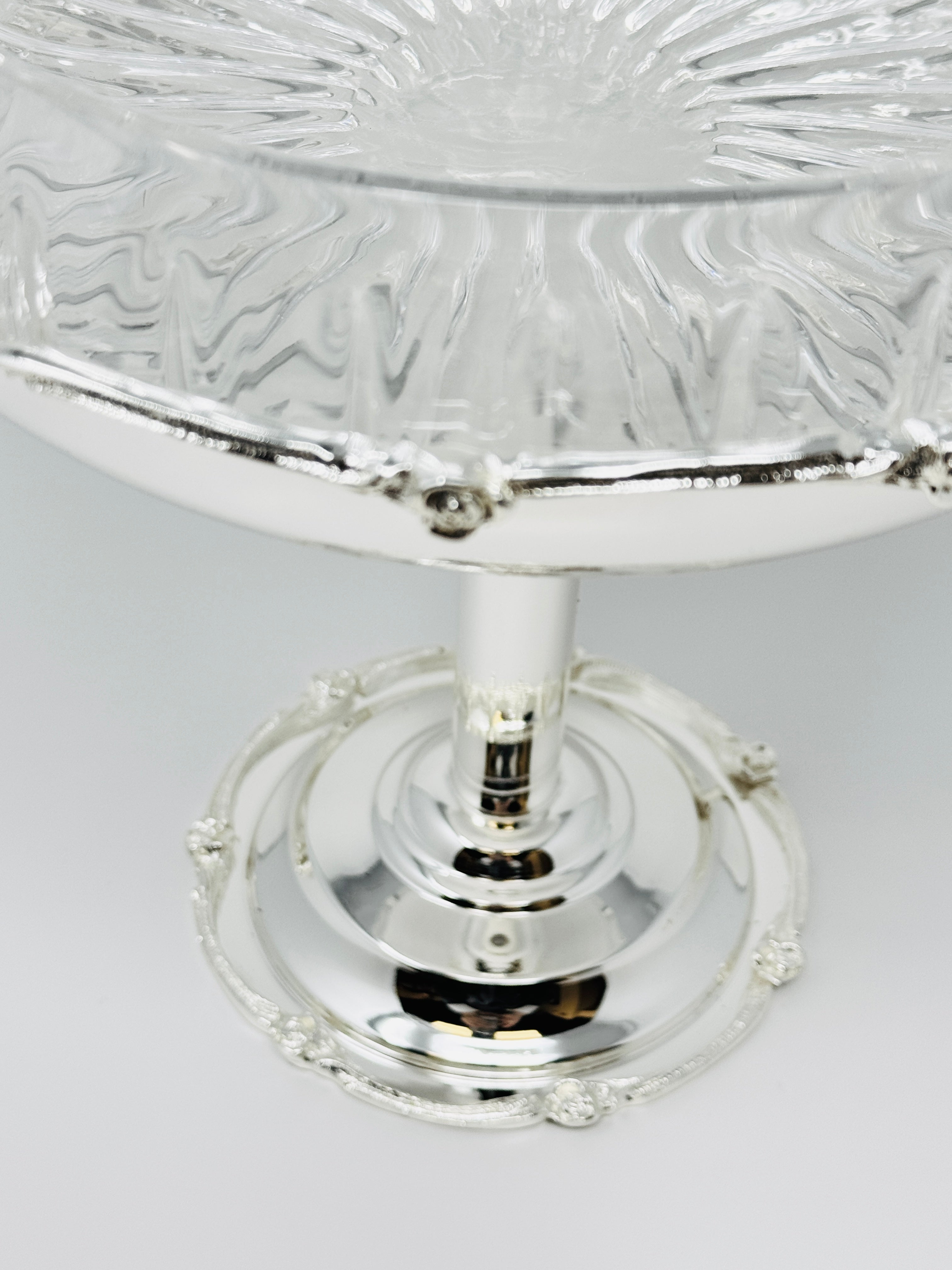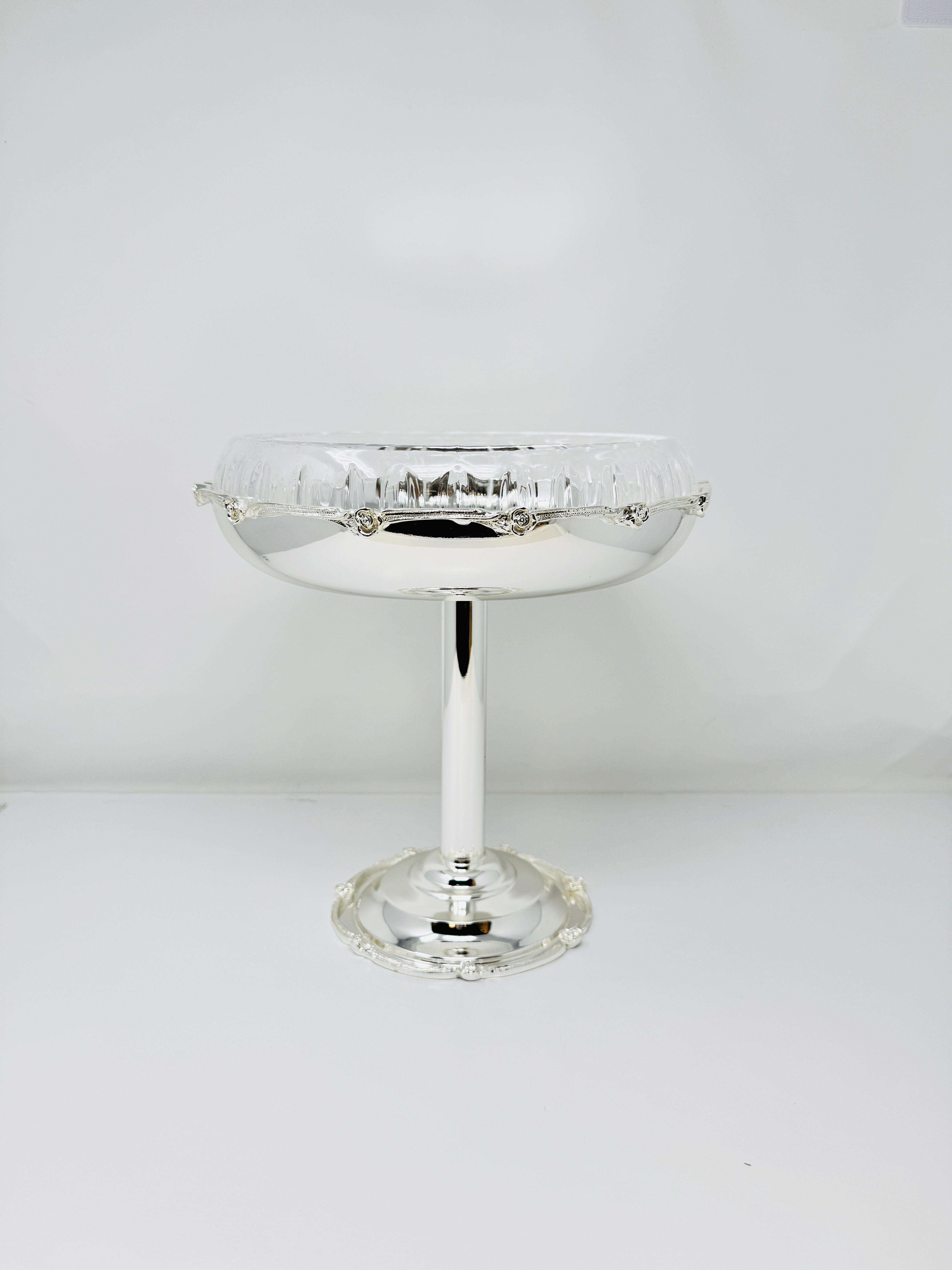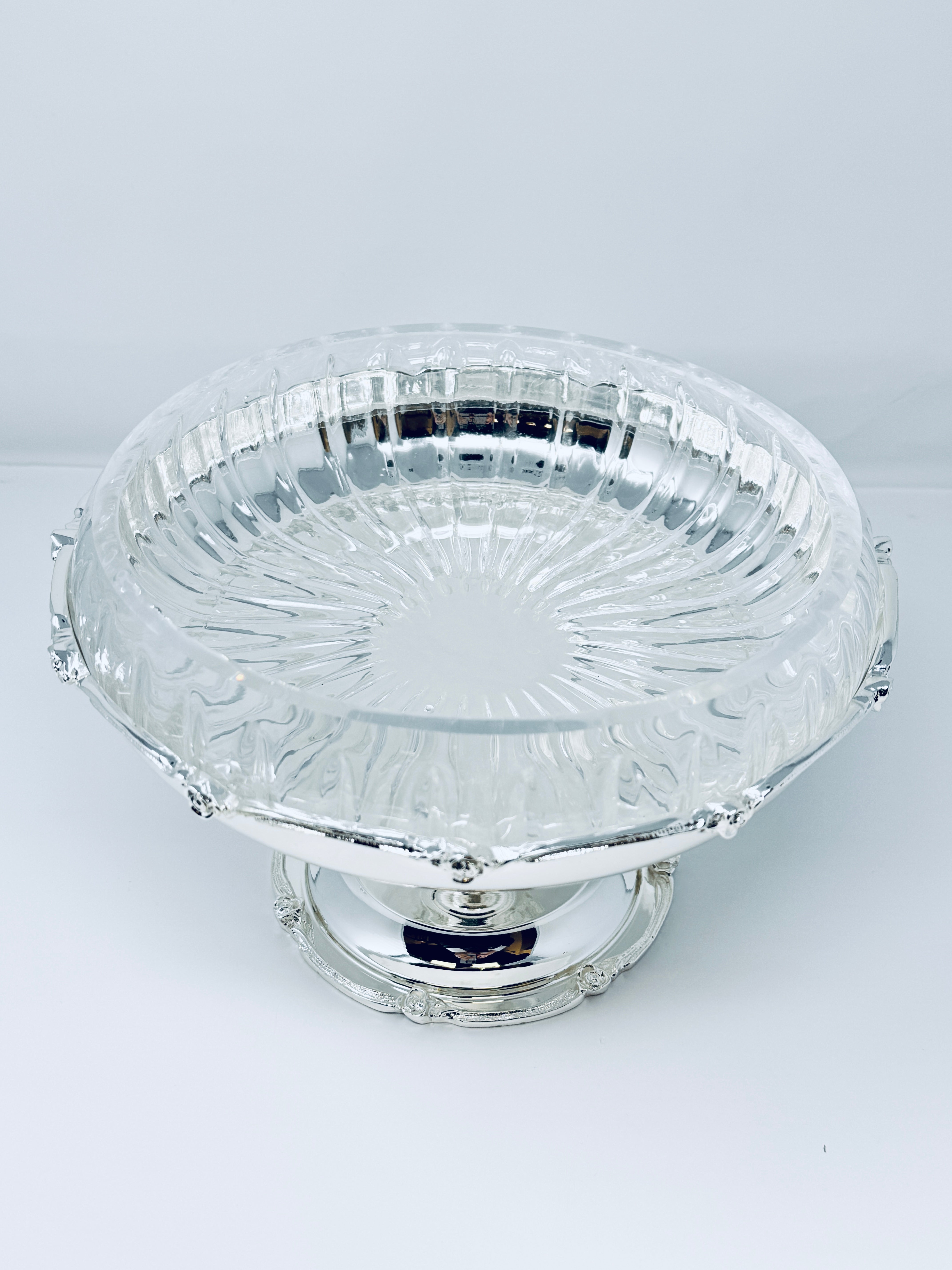 GLASS FRUIT BOWL ON SILVER TONE FOOT STAND