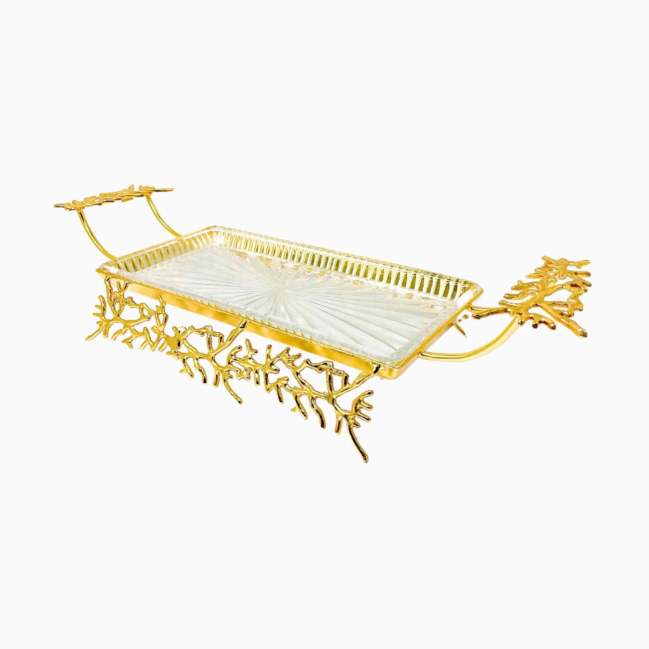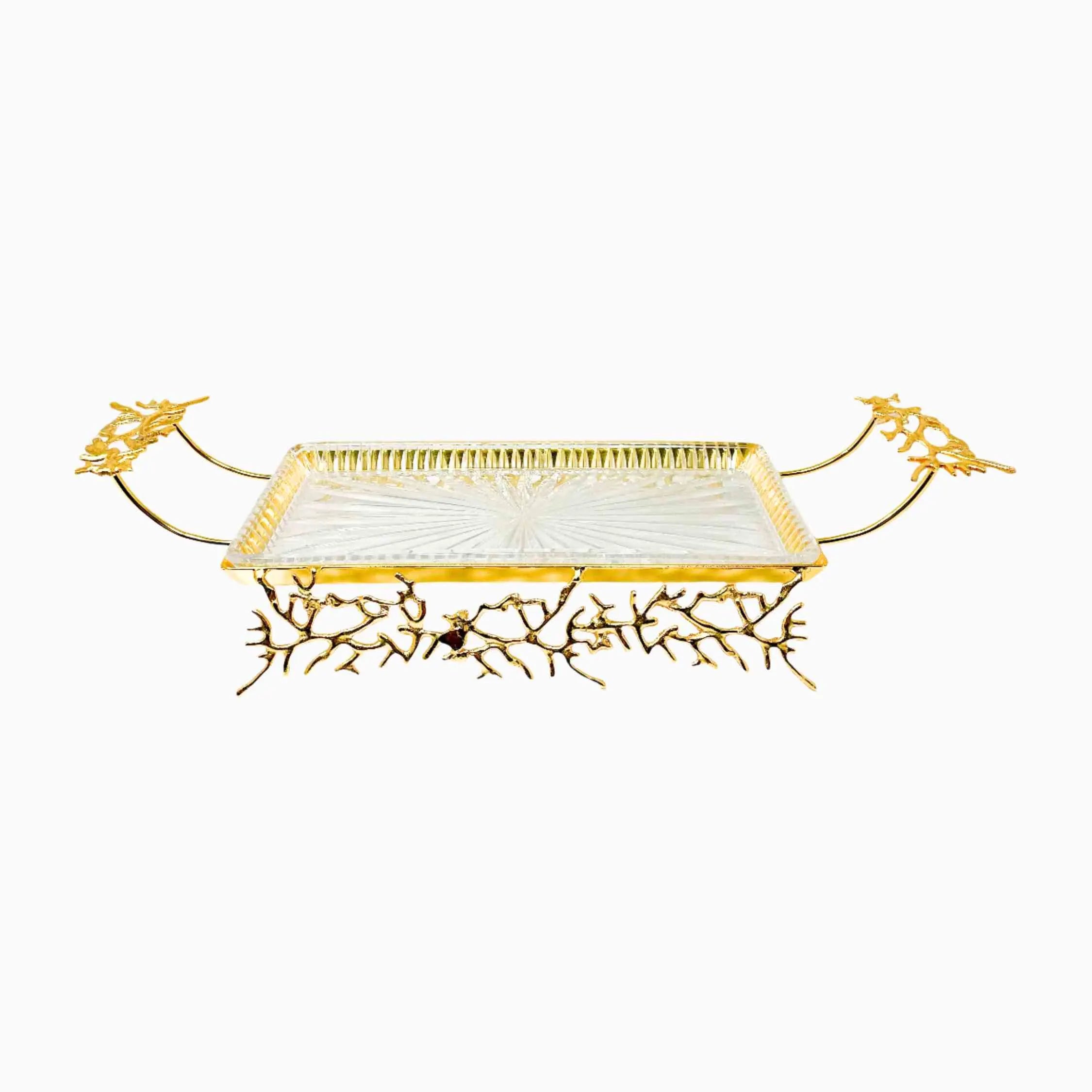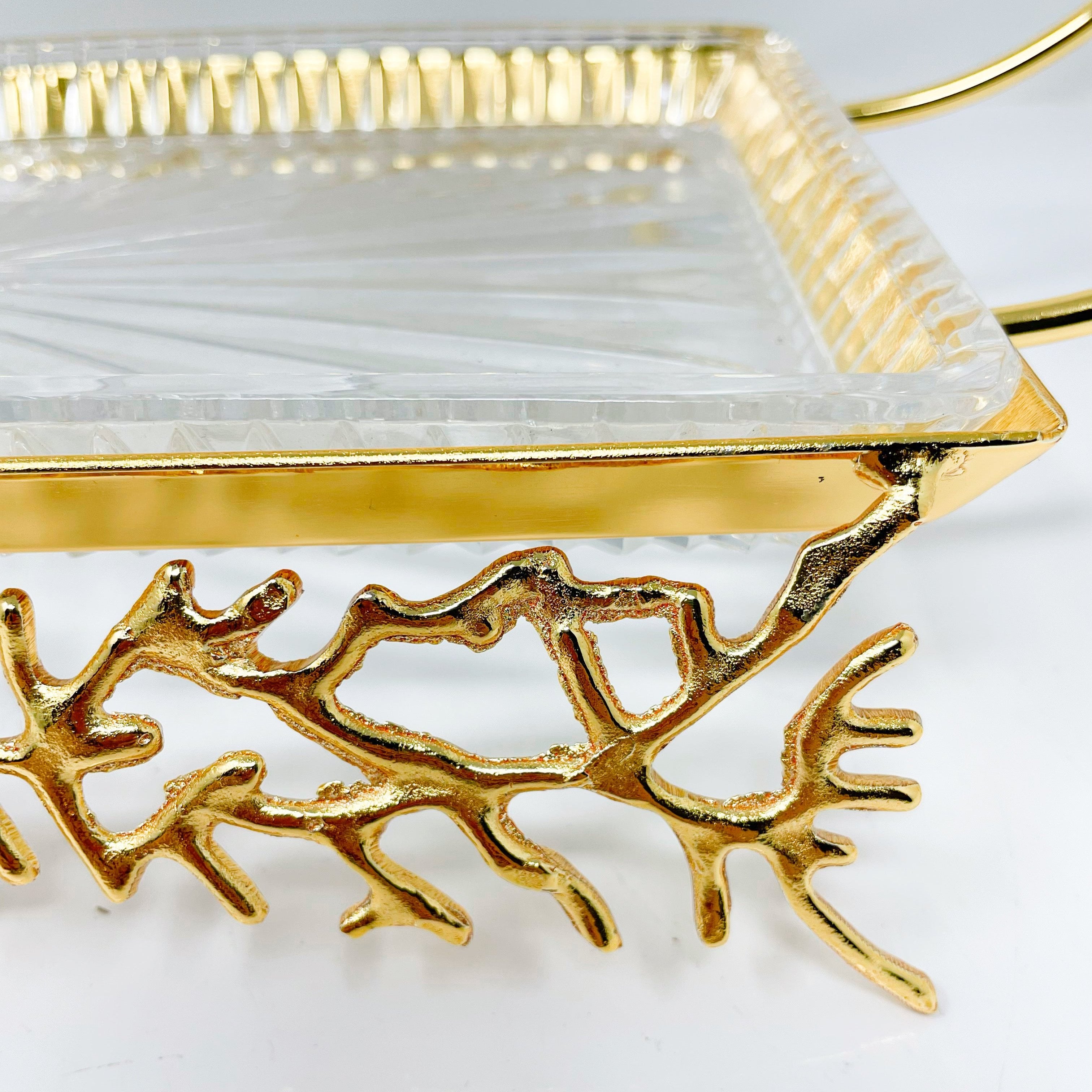 GLASS SERVING TRAY ON GOLDEN TONE STAND