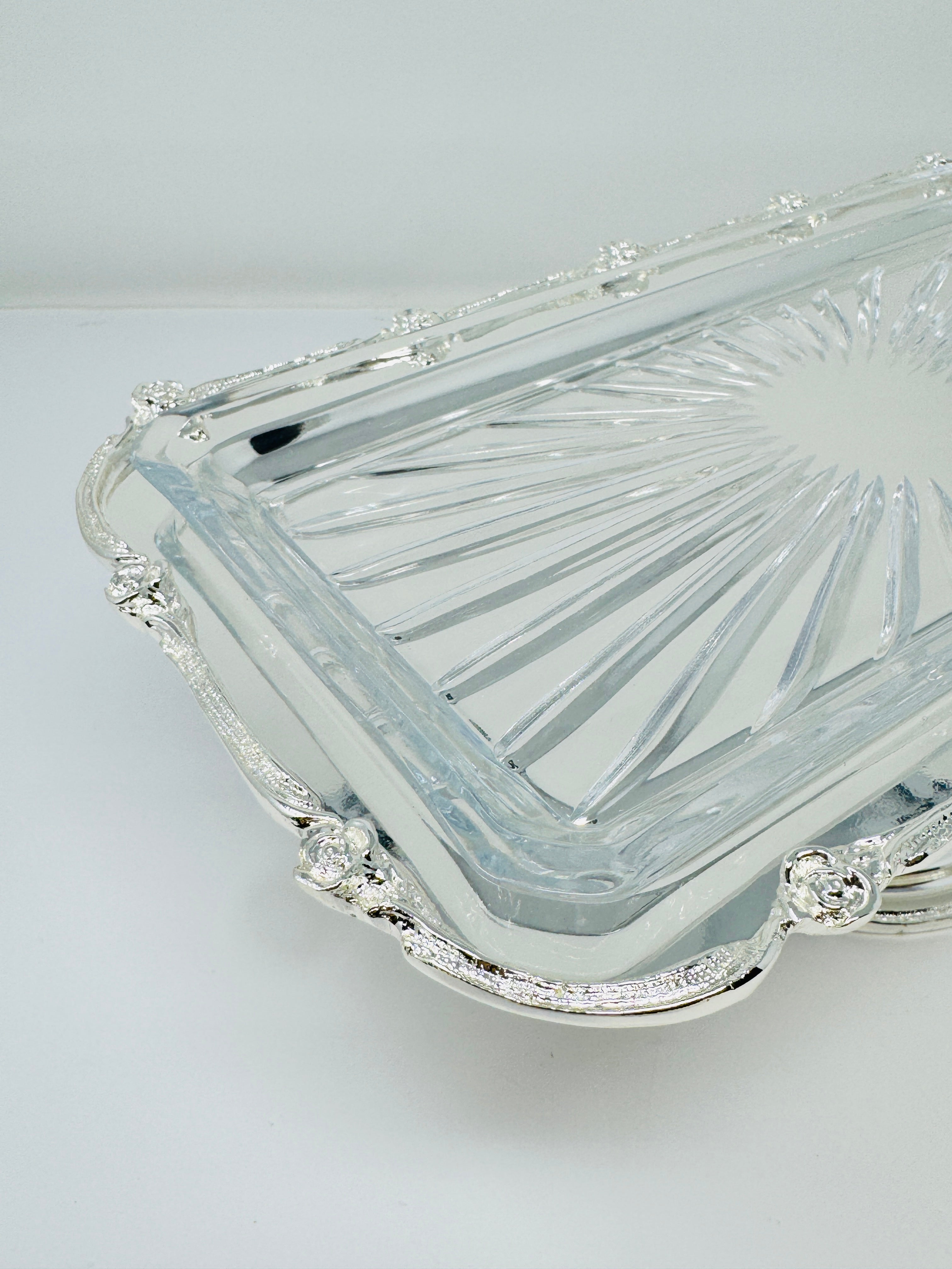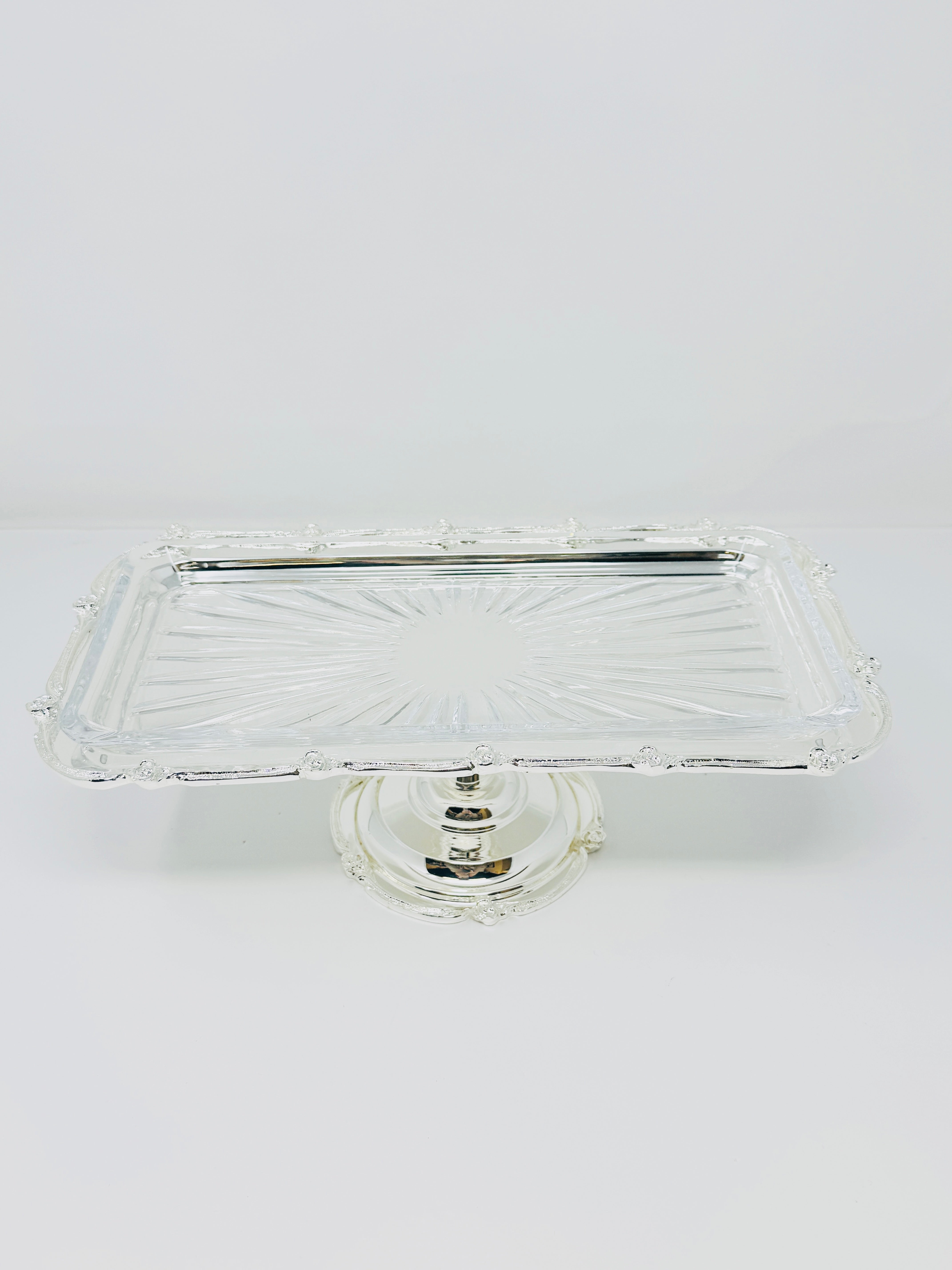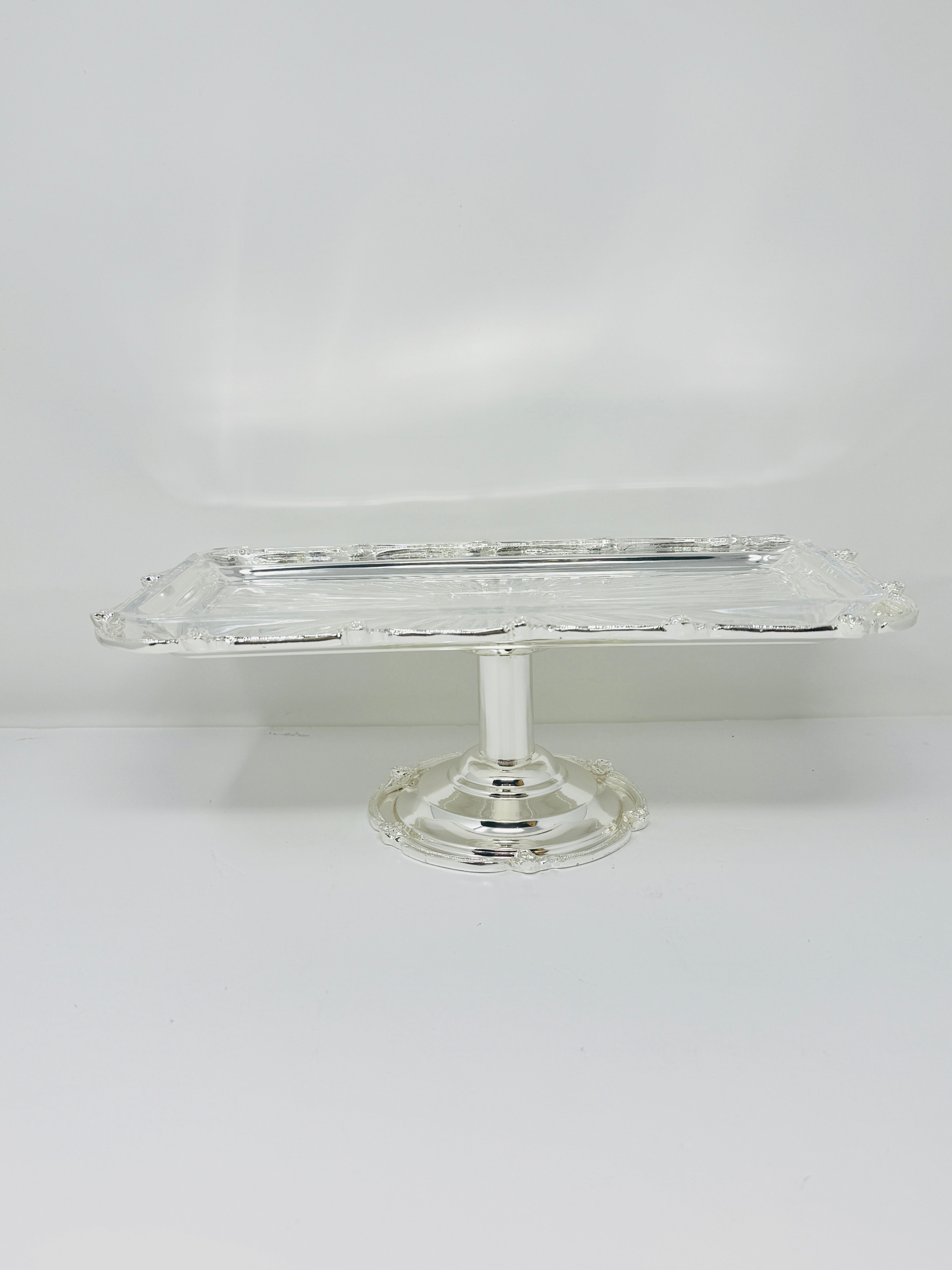 This beautiful Rectangular Serving Plate on Sliver Tone Stand is the perfect addition to any serveware collection. It can be used for serving pastries or food to guests. It can also be used as a decorative piece. Place a candle on top for an elegant look.