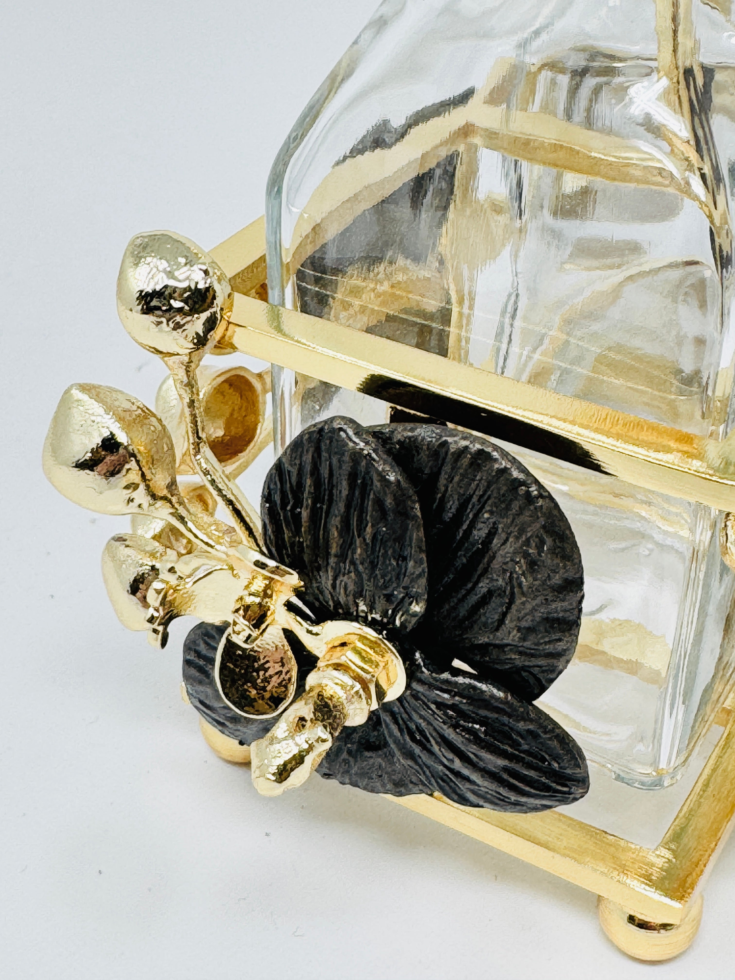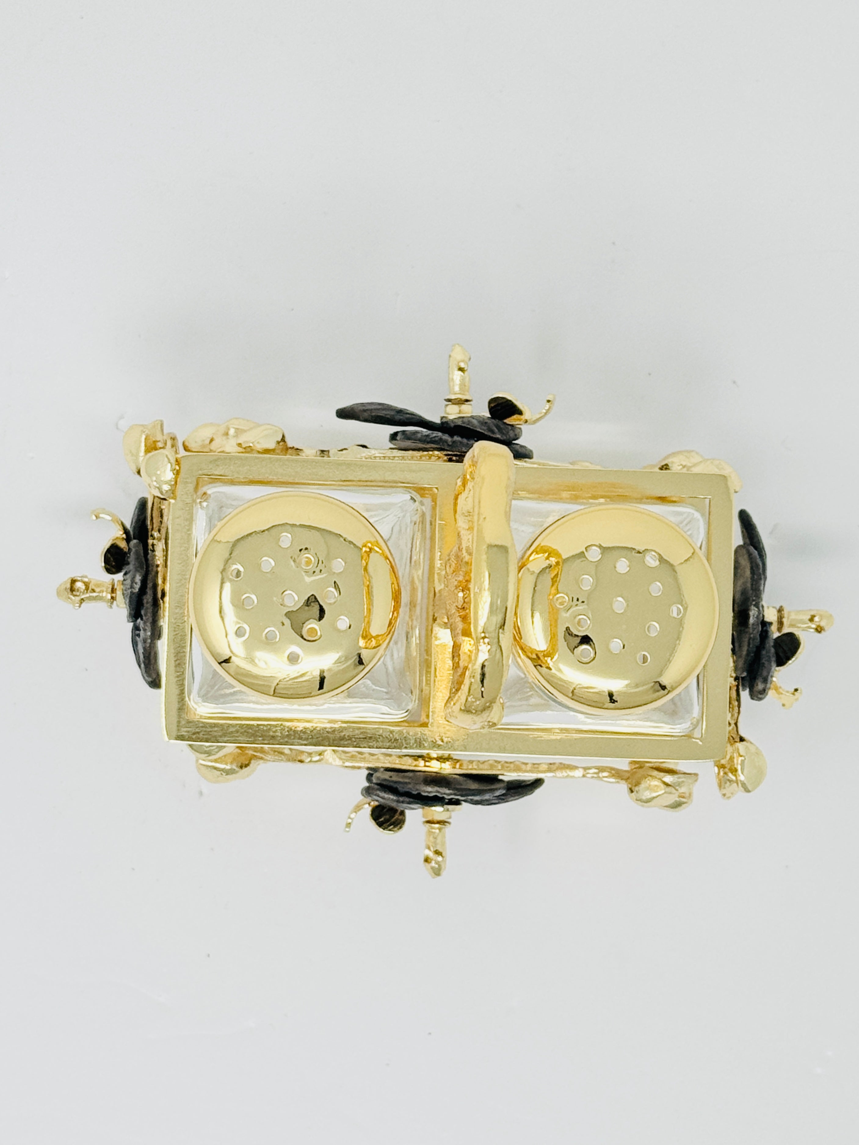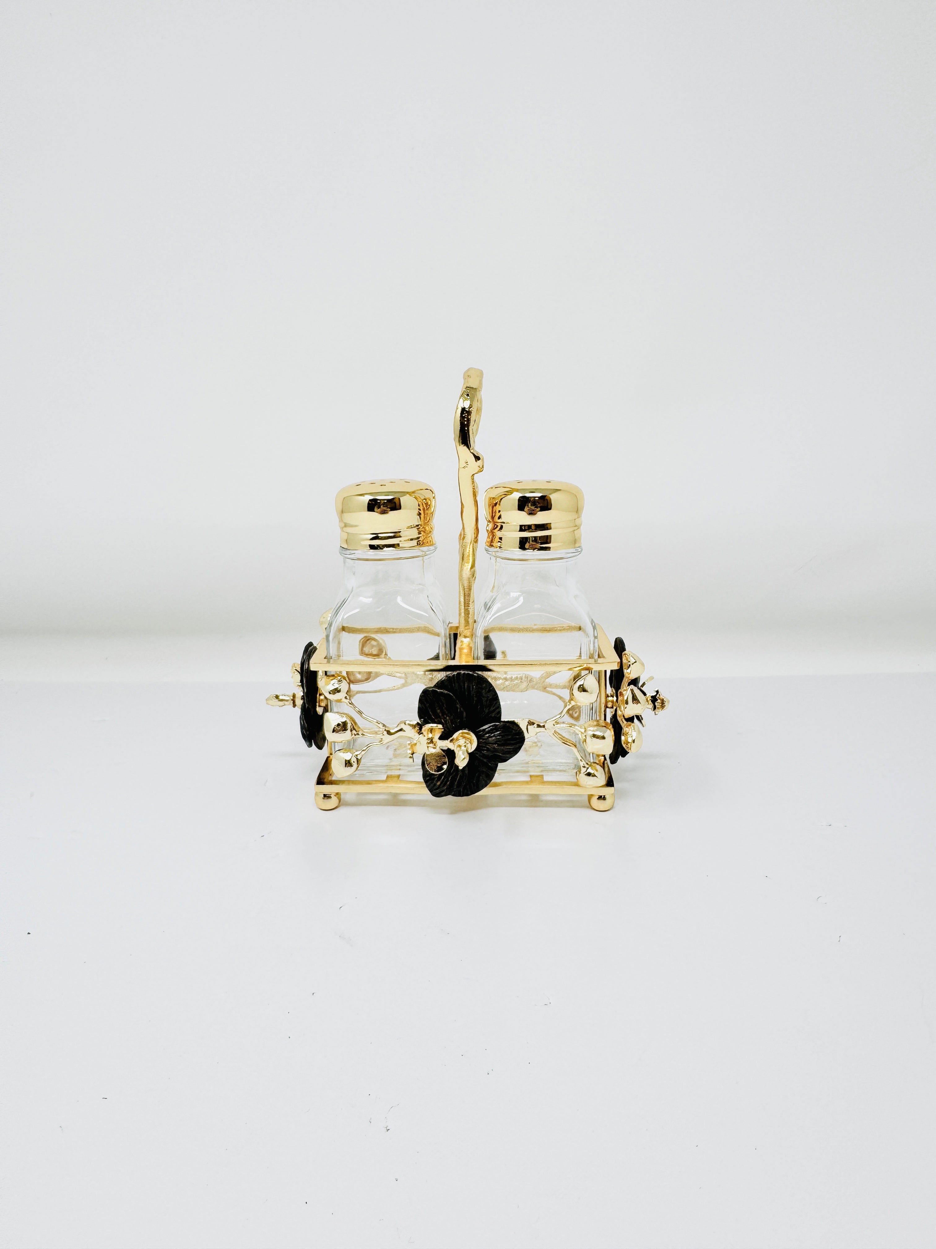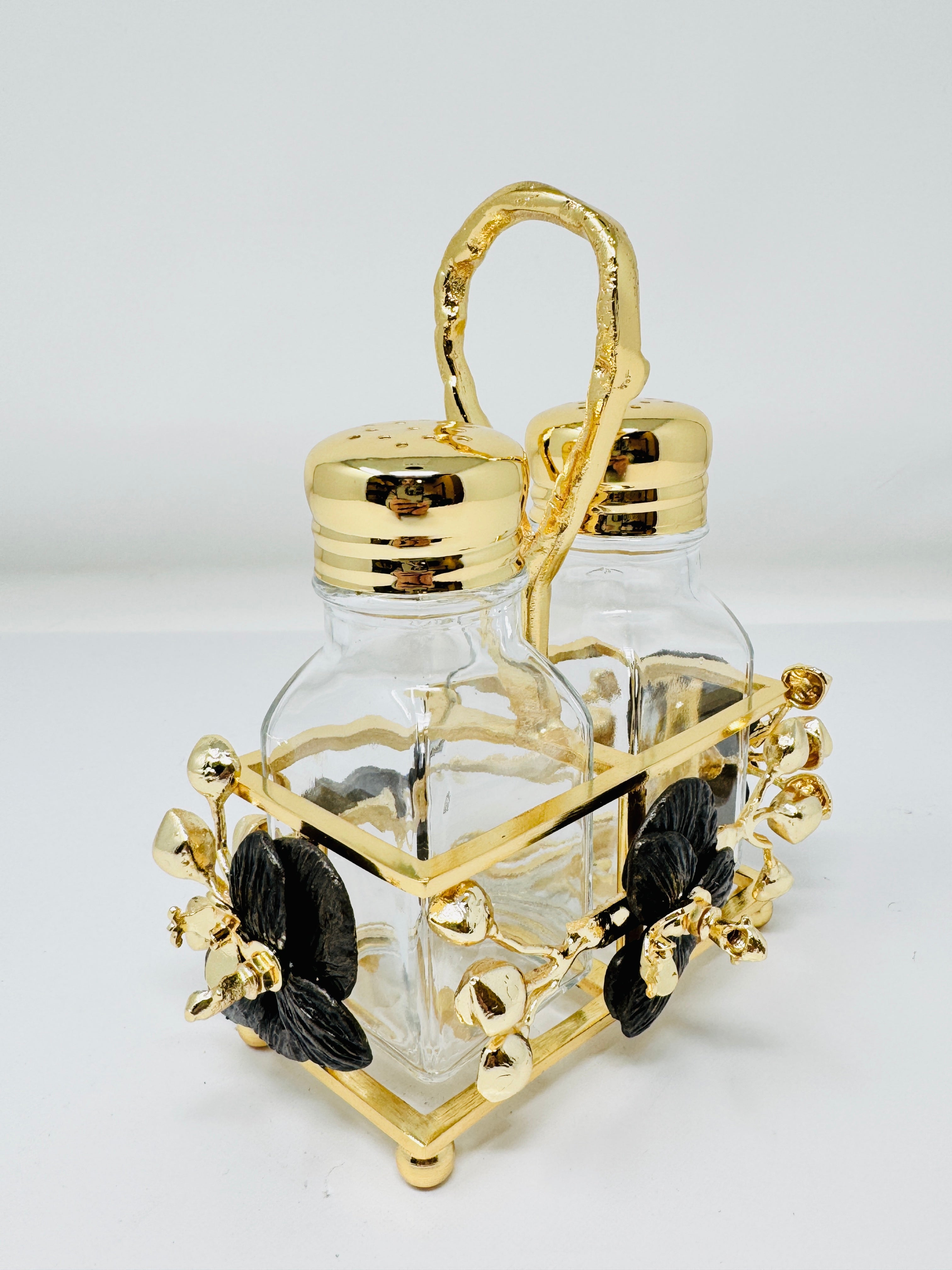GOLDEN TONE SALT AND PEPPER SHAKER SET ON STAND, ORCHID COLLECTION