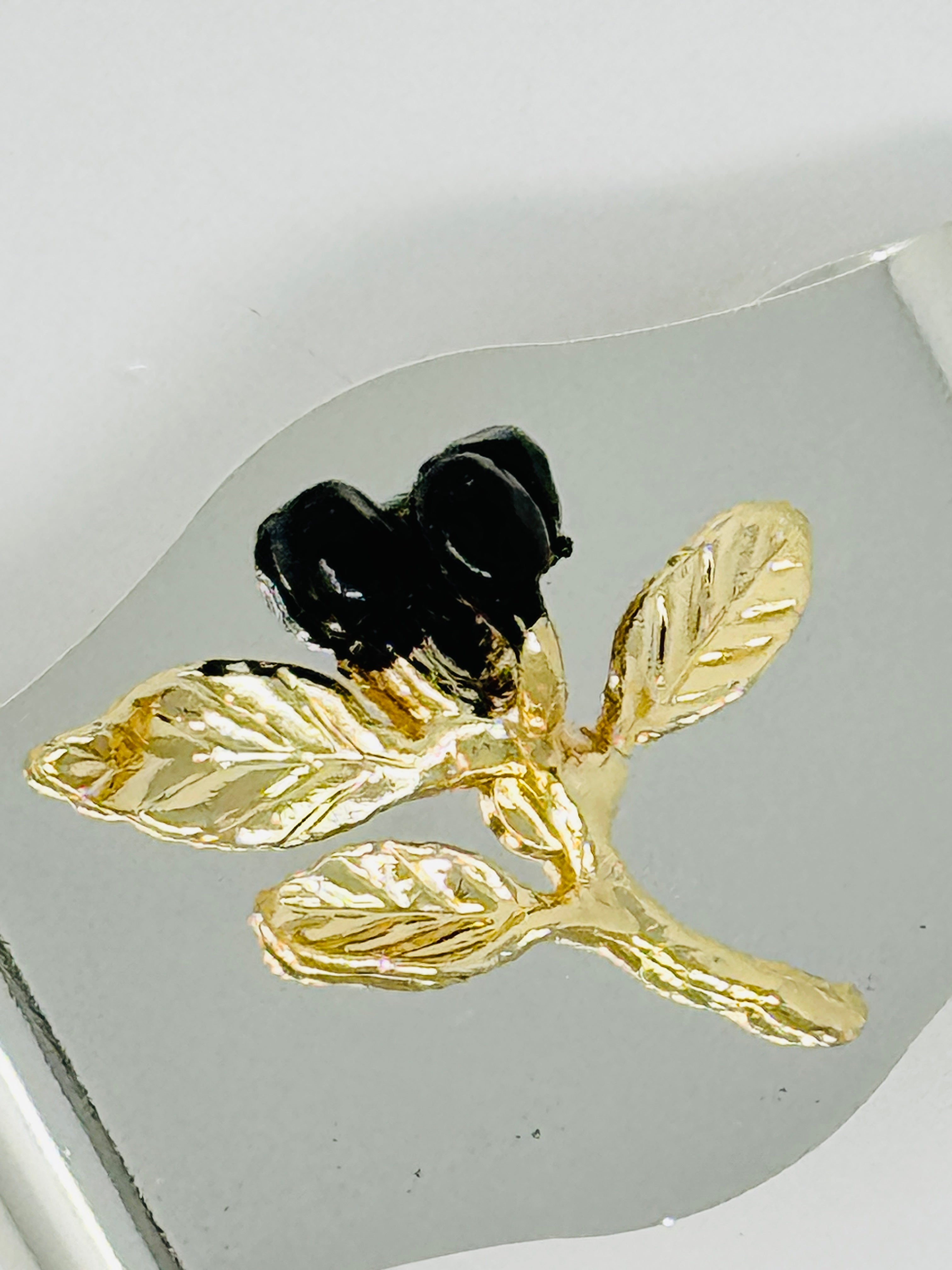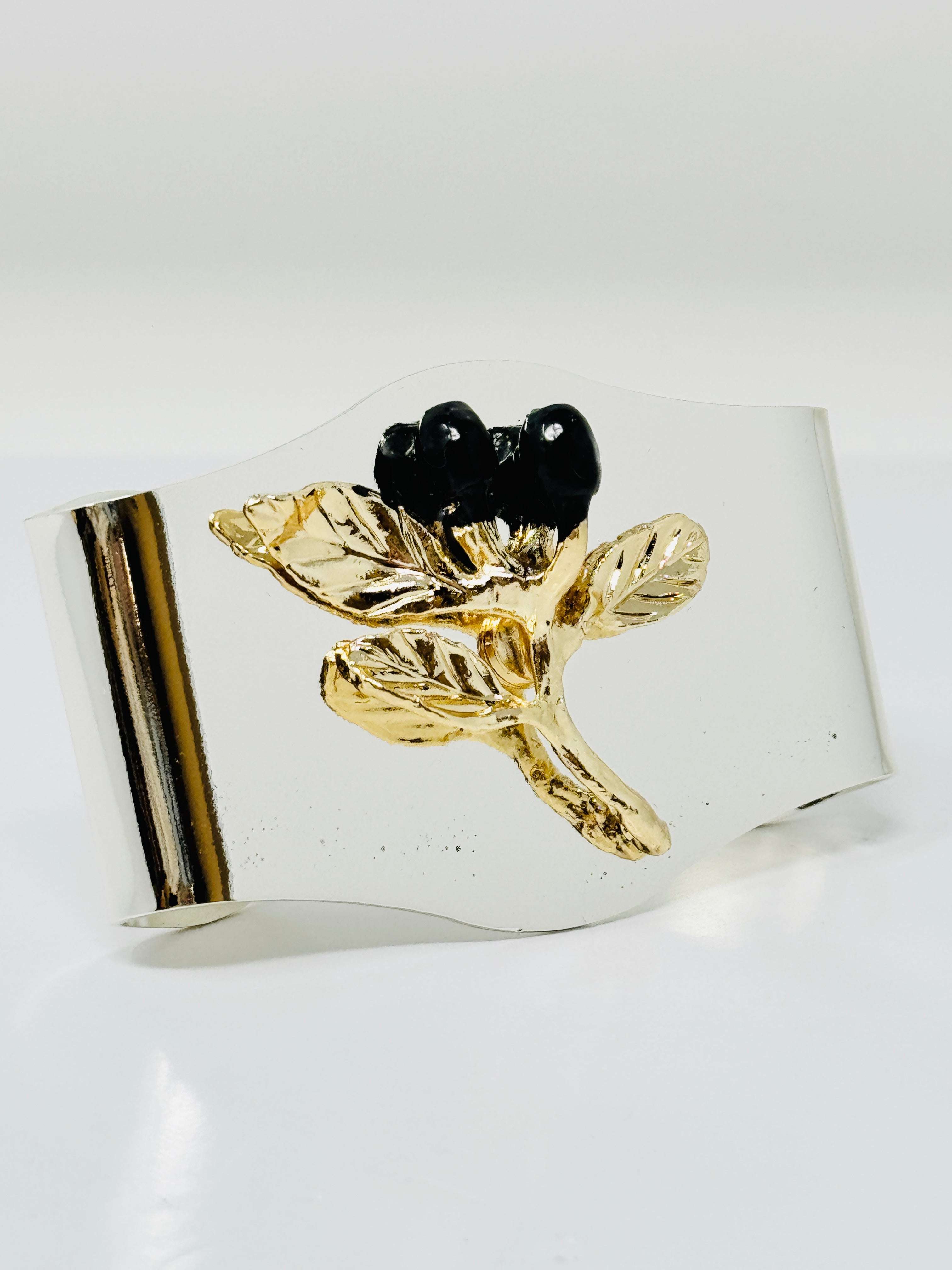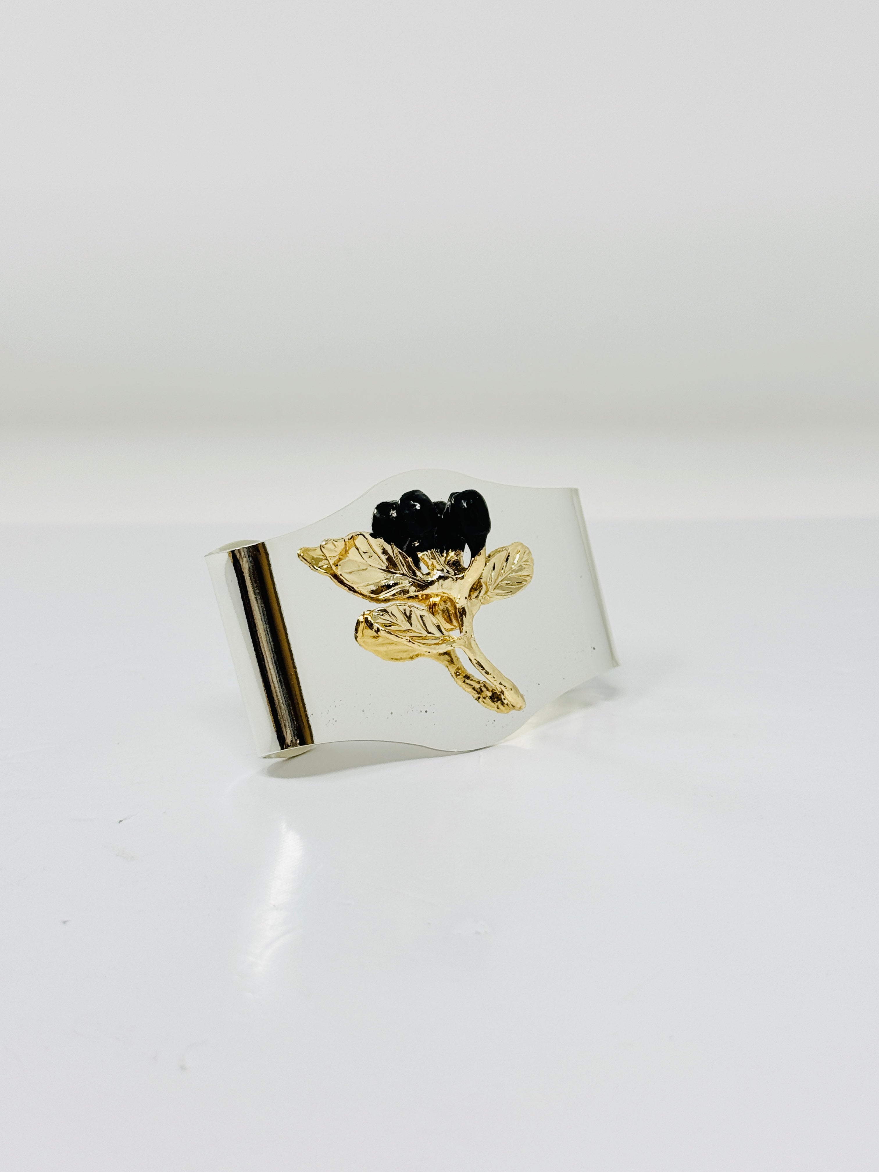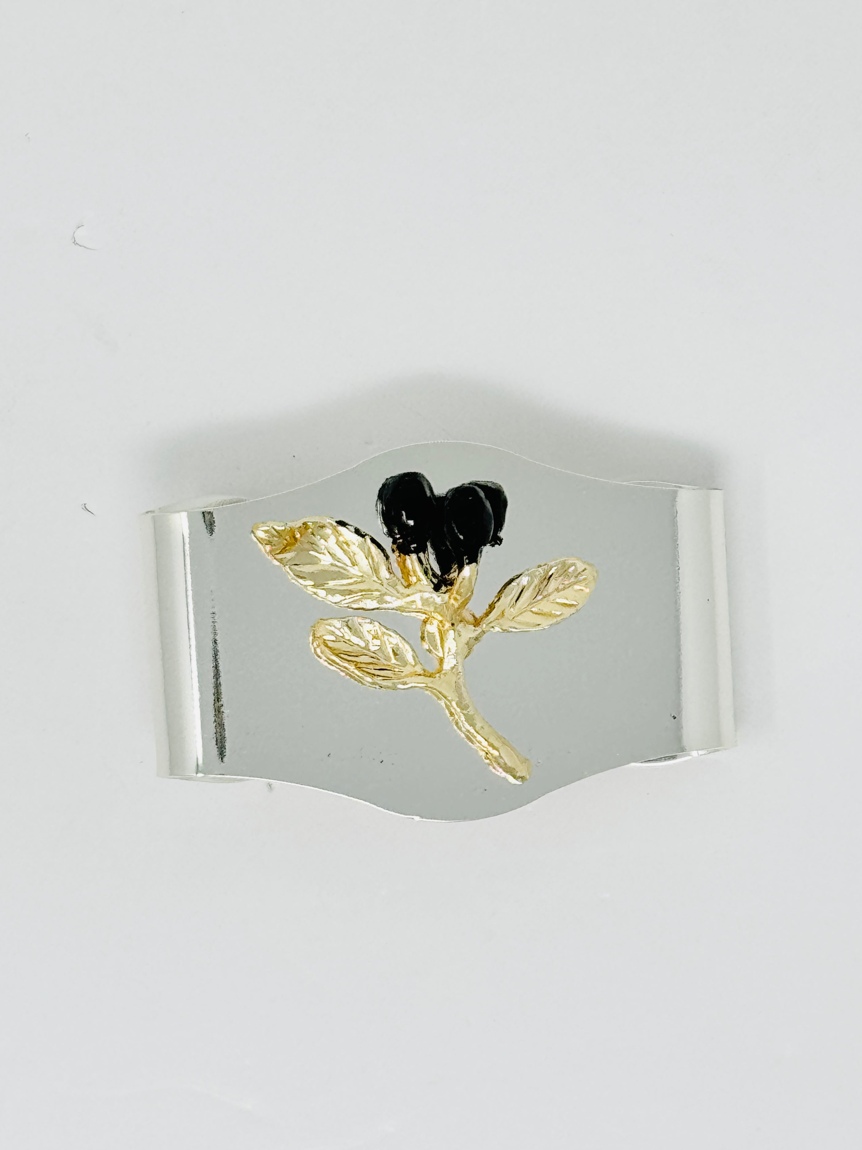 This elegant napkin ring features a polished silver tone band accented with a delicate gold olive branch. a refined detail that adds timeless sophistication to any table setting.