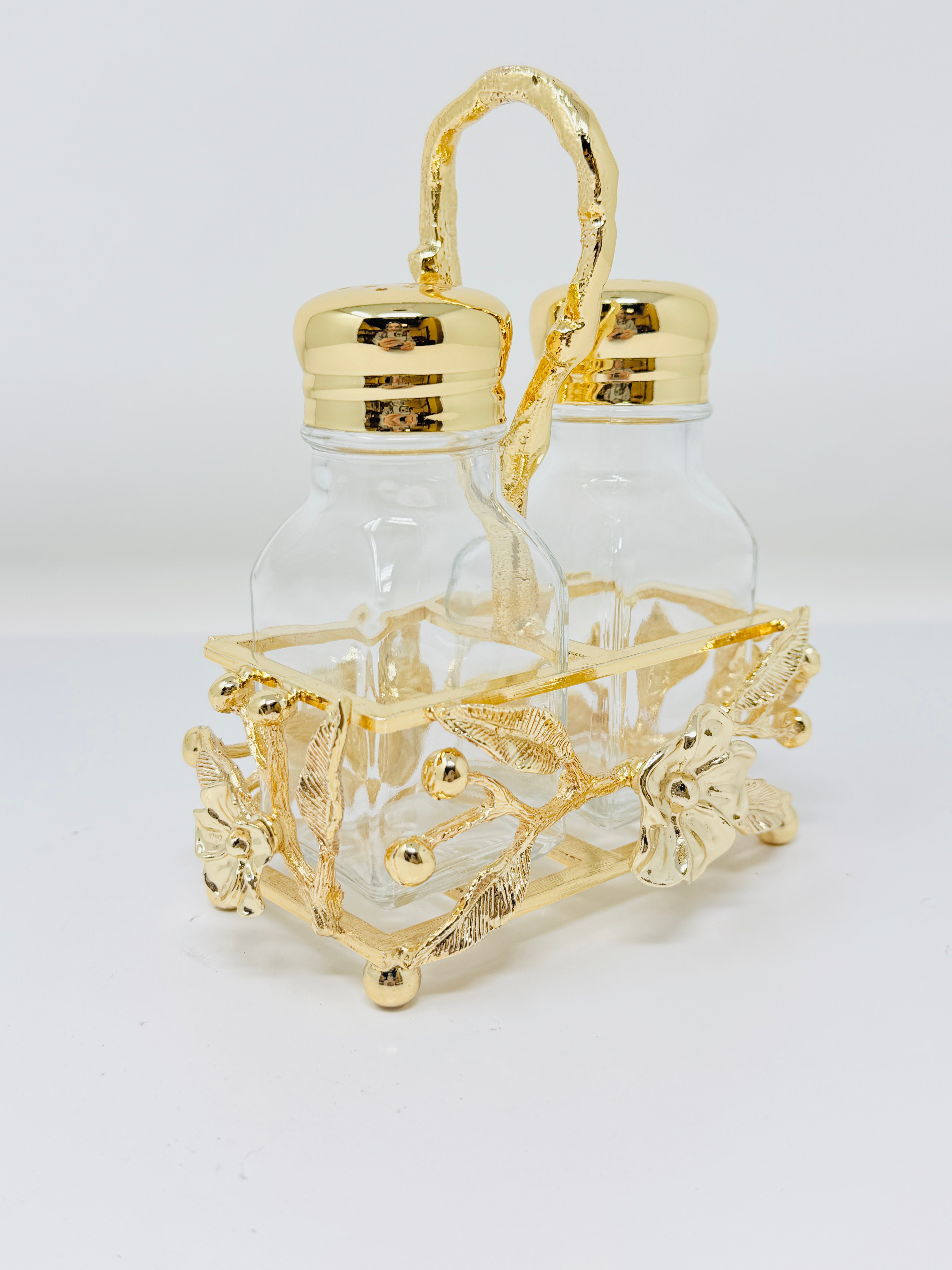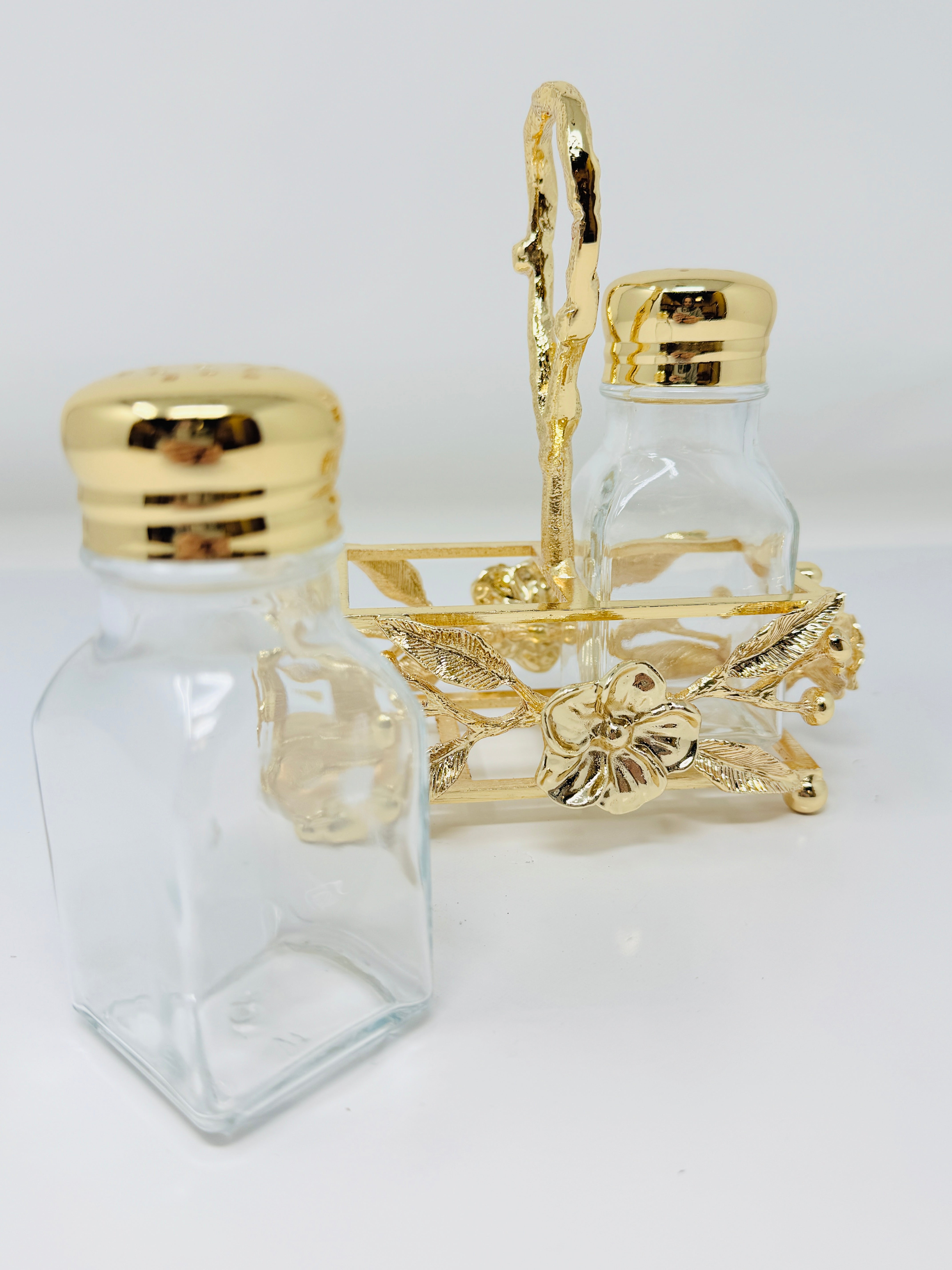 Whether you're entertaining guests or enjoying a quiet family dinner, these Golden Tone Salt and Pepper Shakers accented with Flowers are the perfect addition to your table. Elevate your dining experience with every sprinkle.