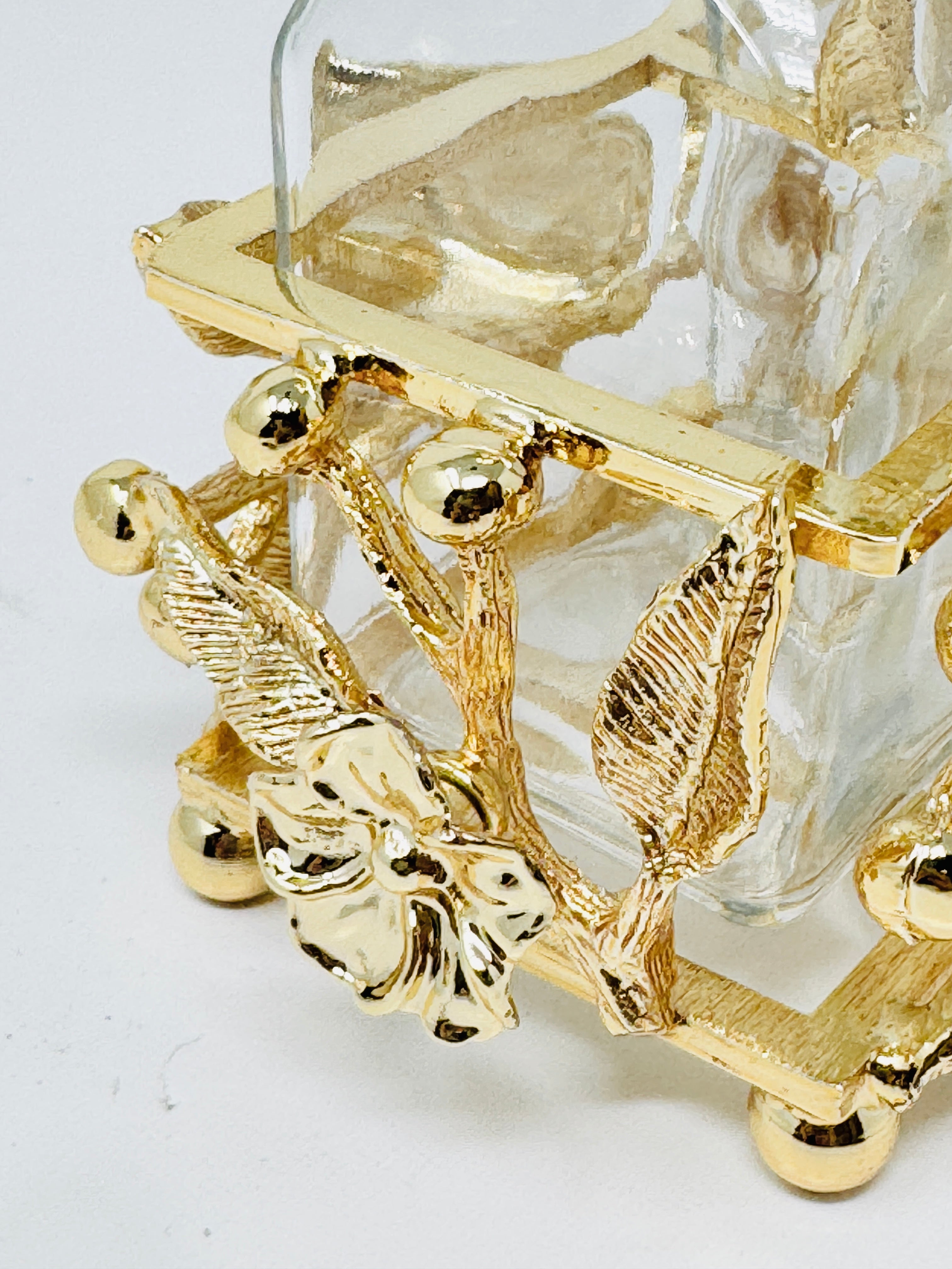 GOLDEN TONE SALT AND PEPPER SHAKER SET ON STAND