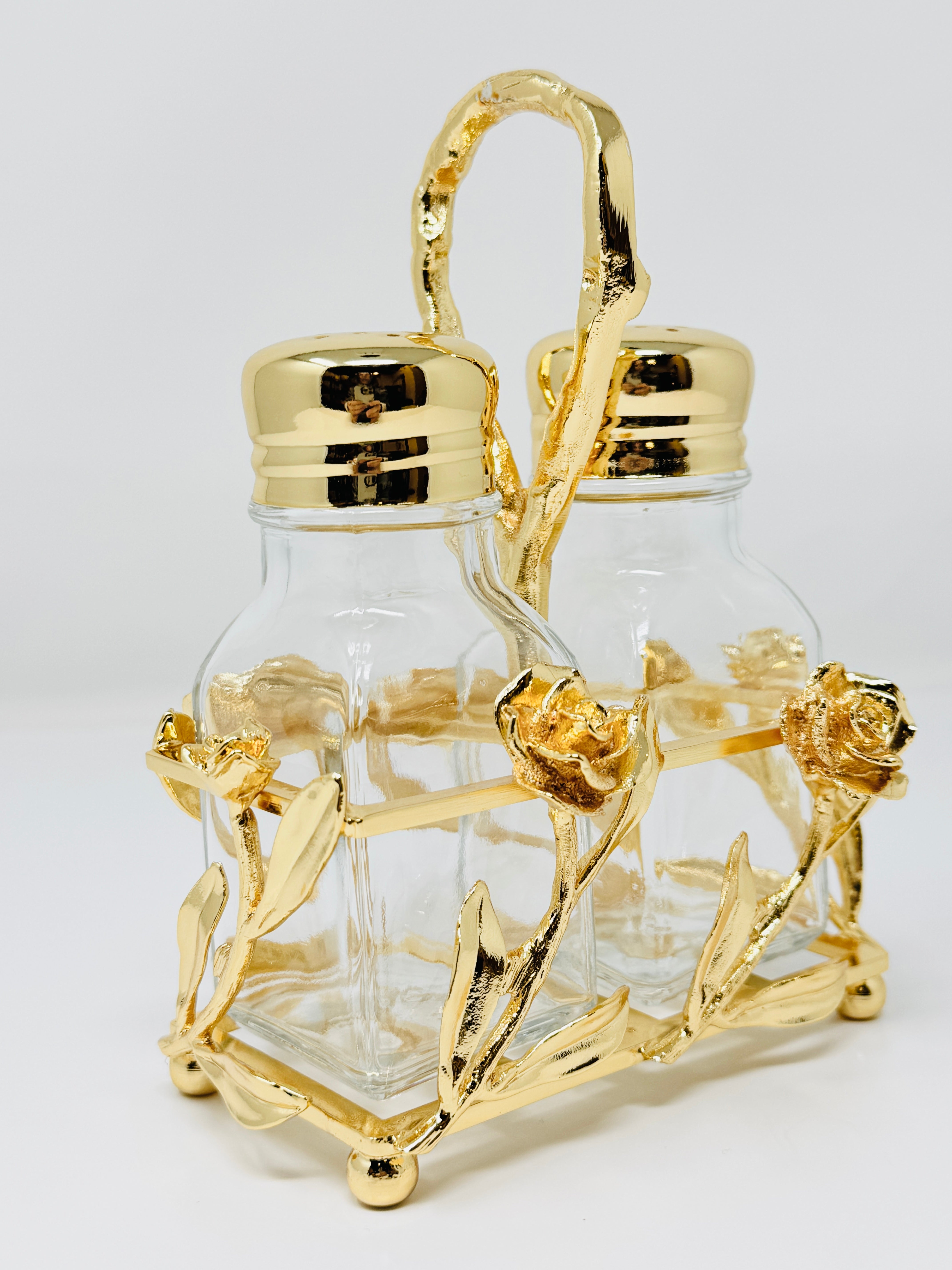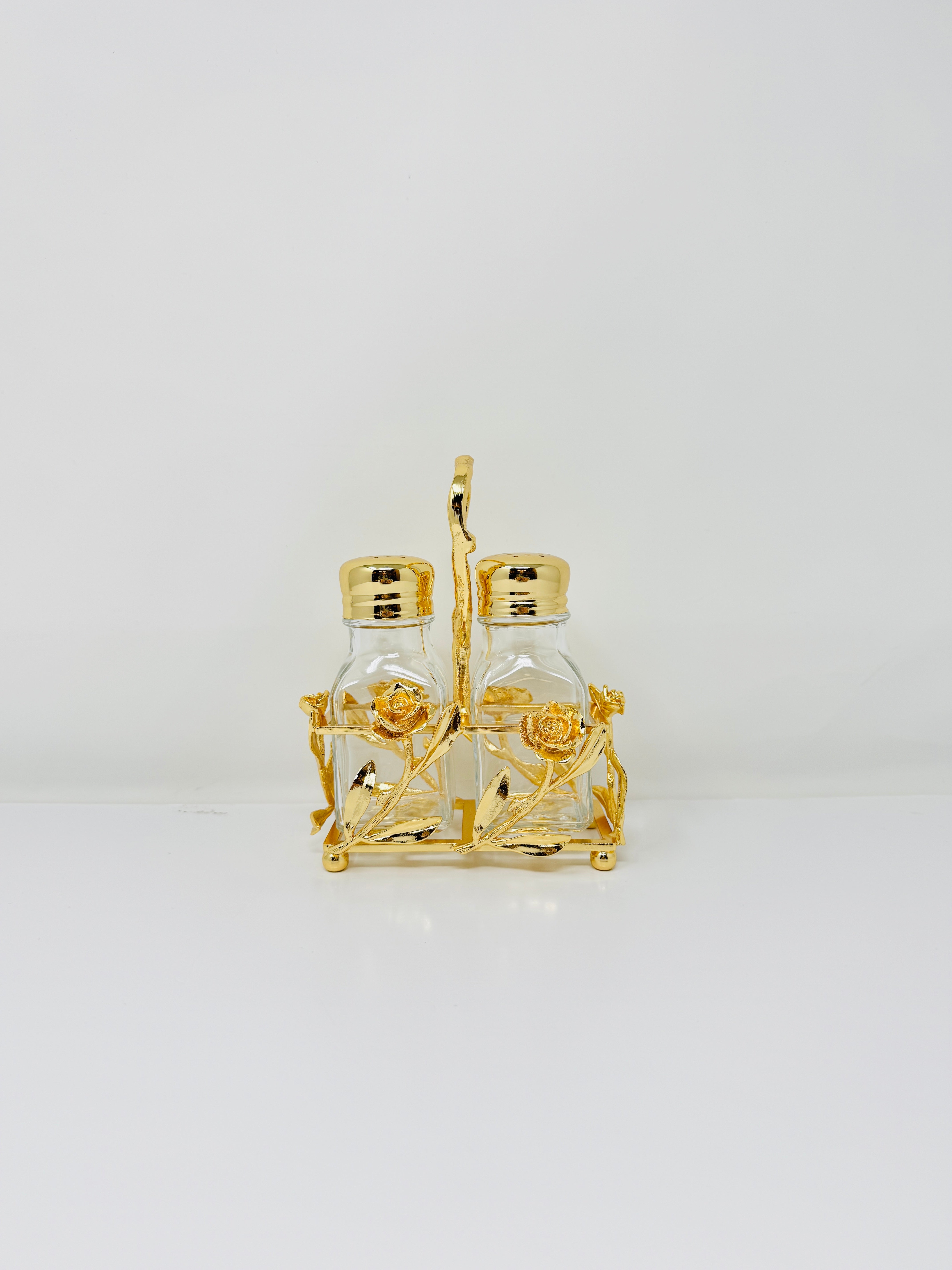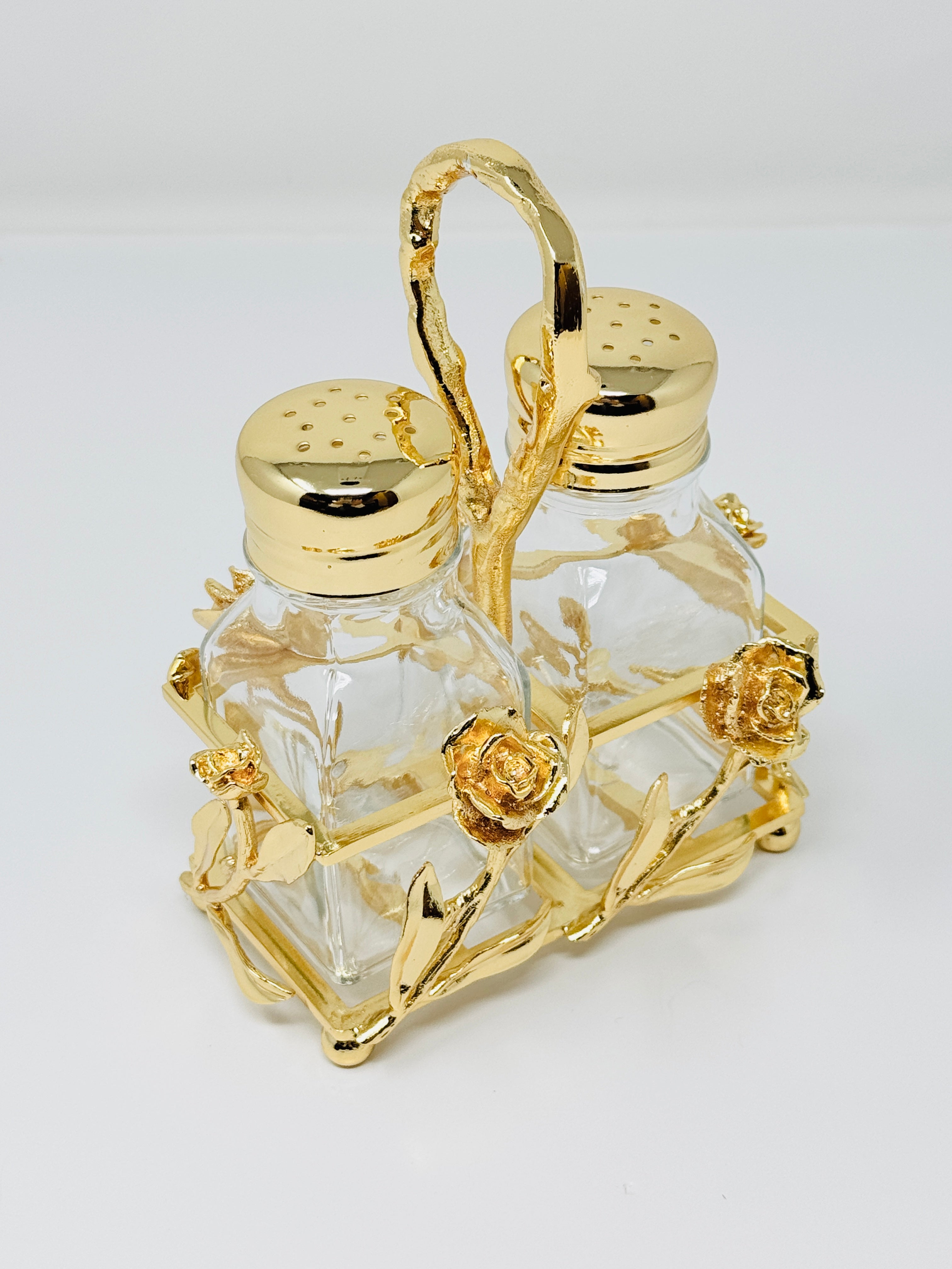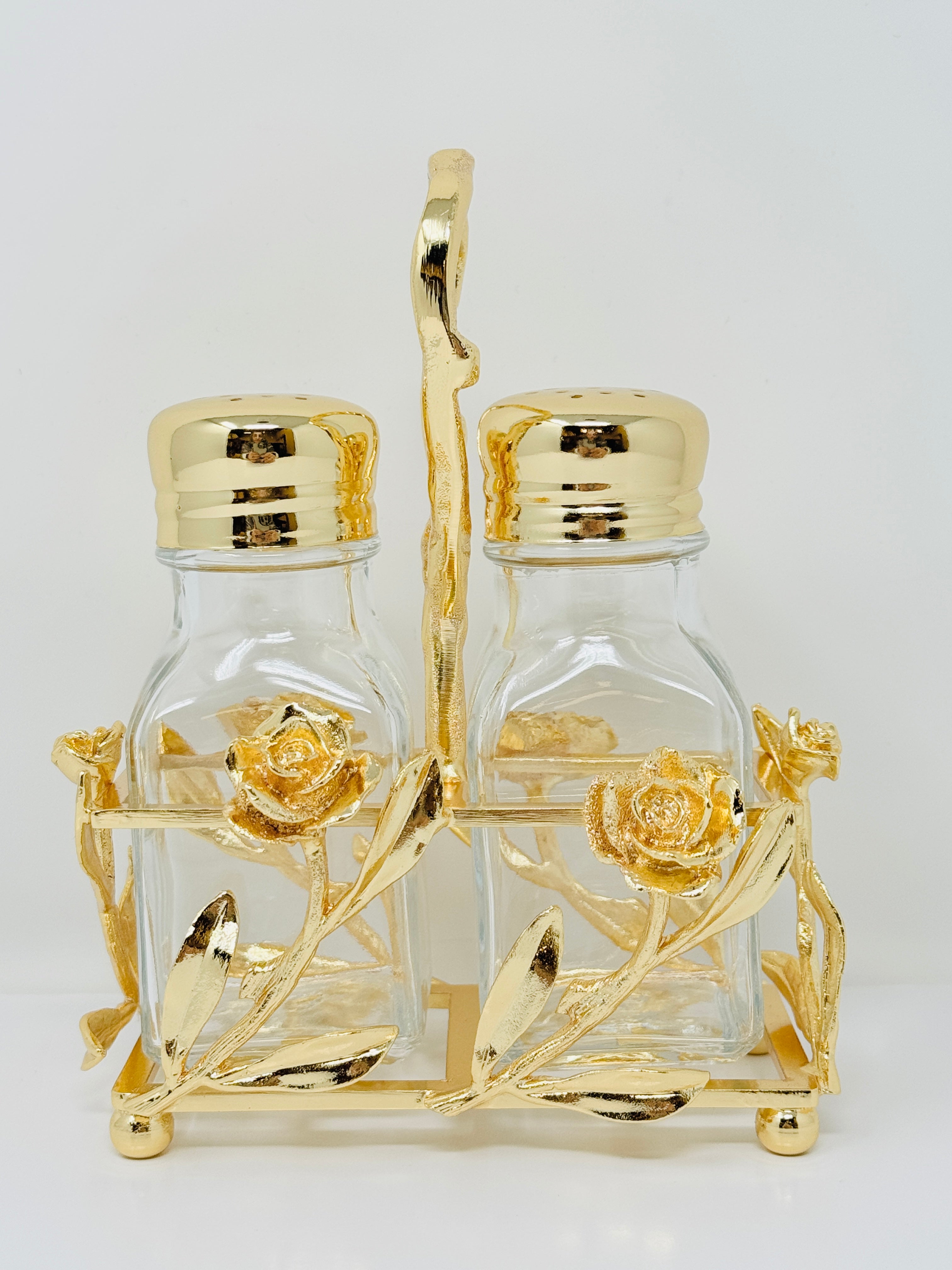 GOLDEN TONE SALT AND PEPPER SHAKER SET ON STAND, ROSE COLLECTION
