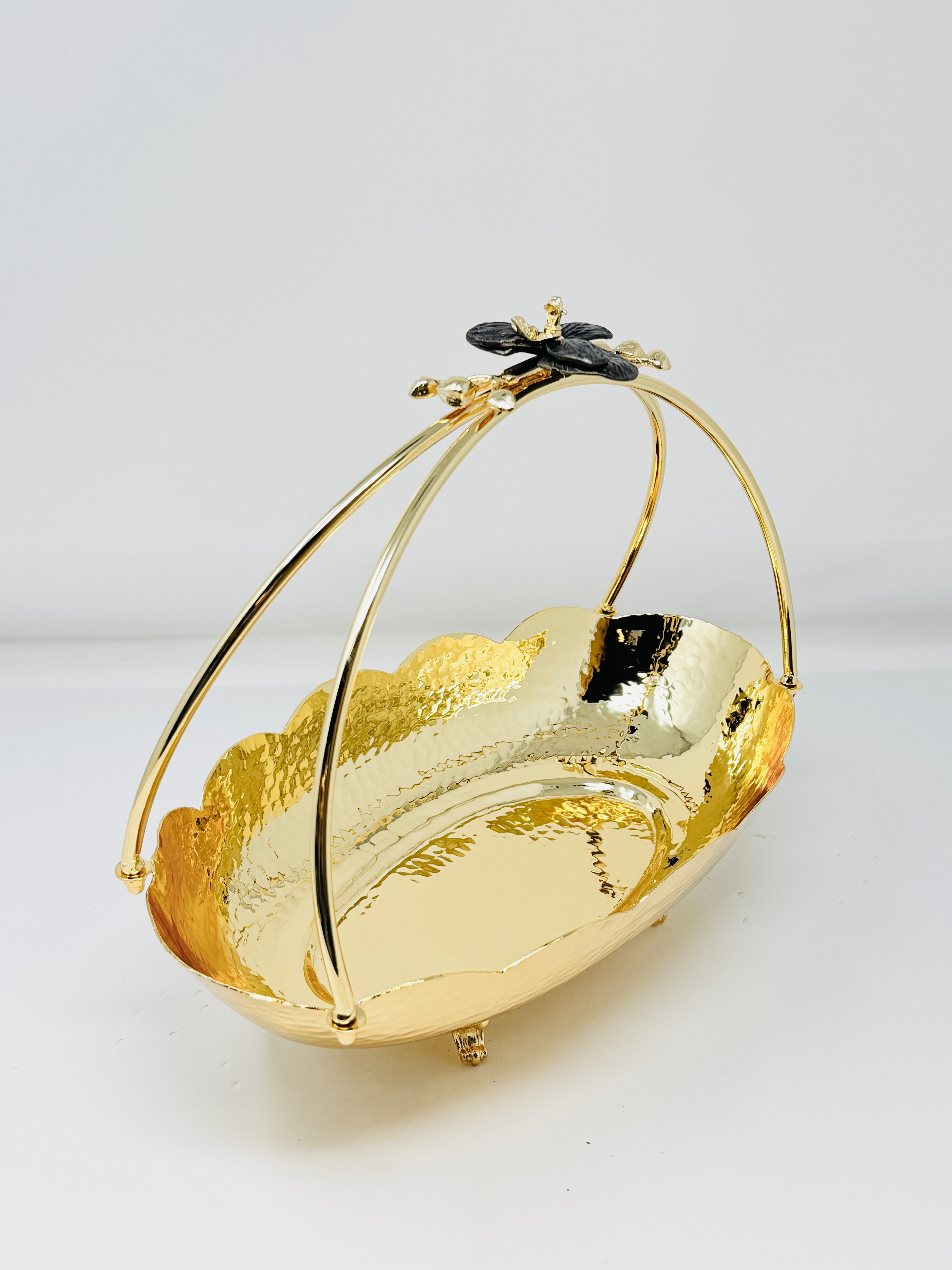 This Golden Tone Fruit Bowl accented with a Orchid Flower is the perfect addition to any party, event or occasion. This item can be used for serving various kinds of meats and vegetables. It can also be used as a decorative item. Place fruit or potpourri inside for an elegant look.