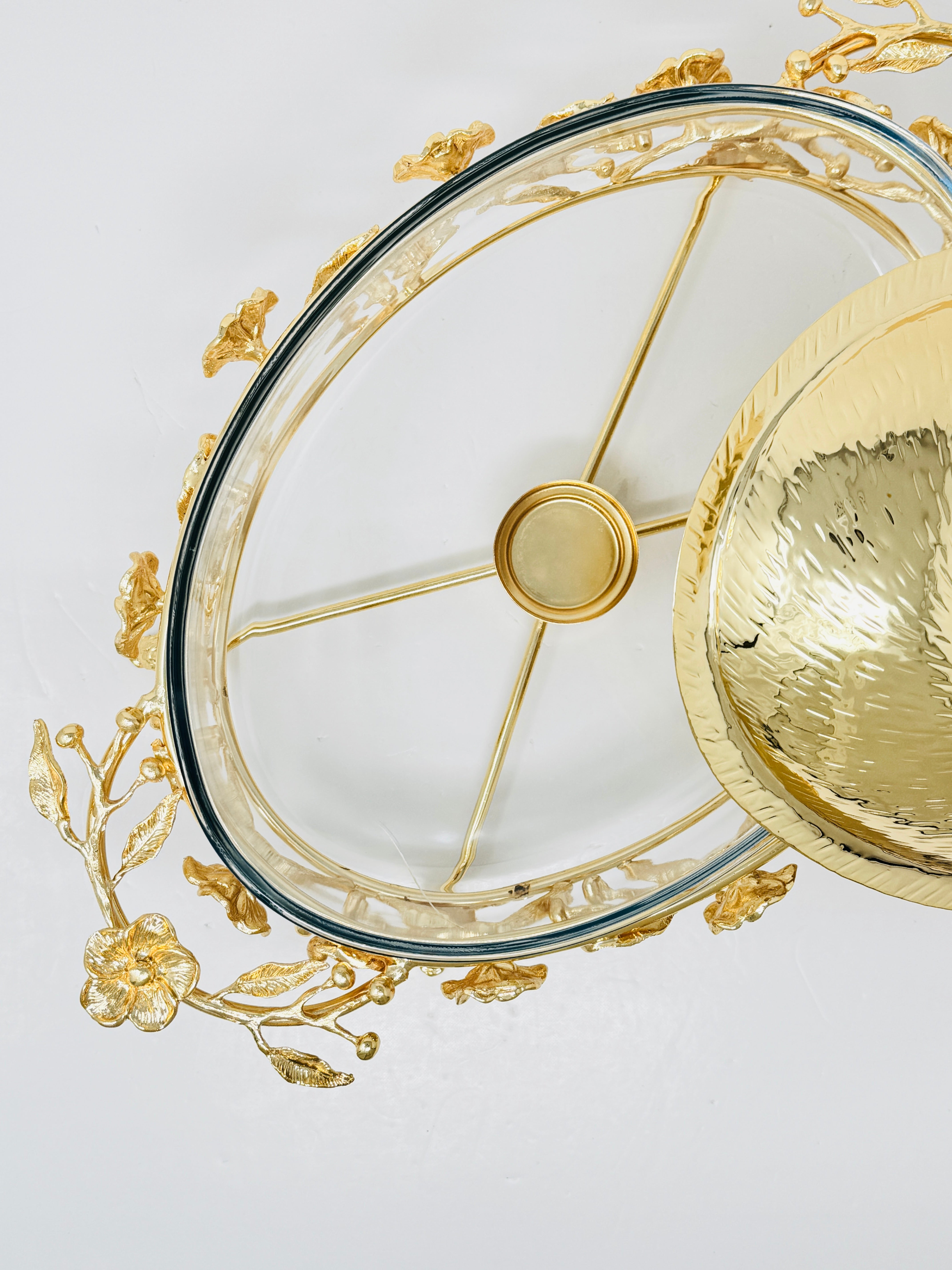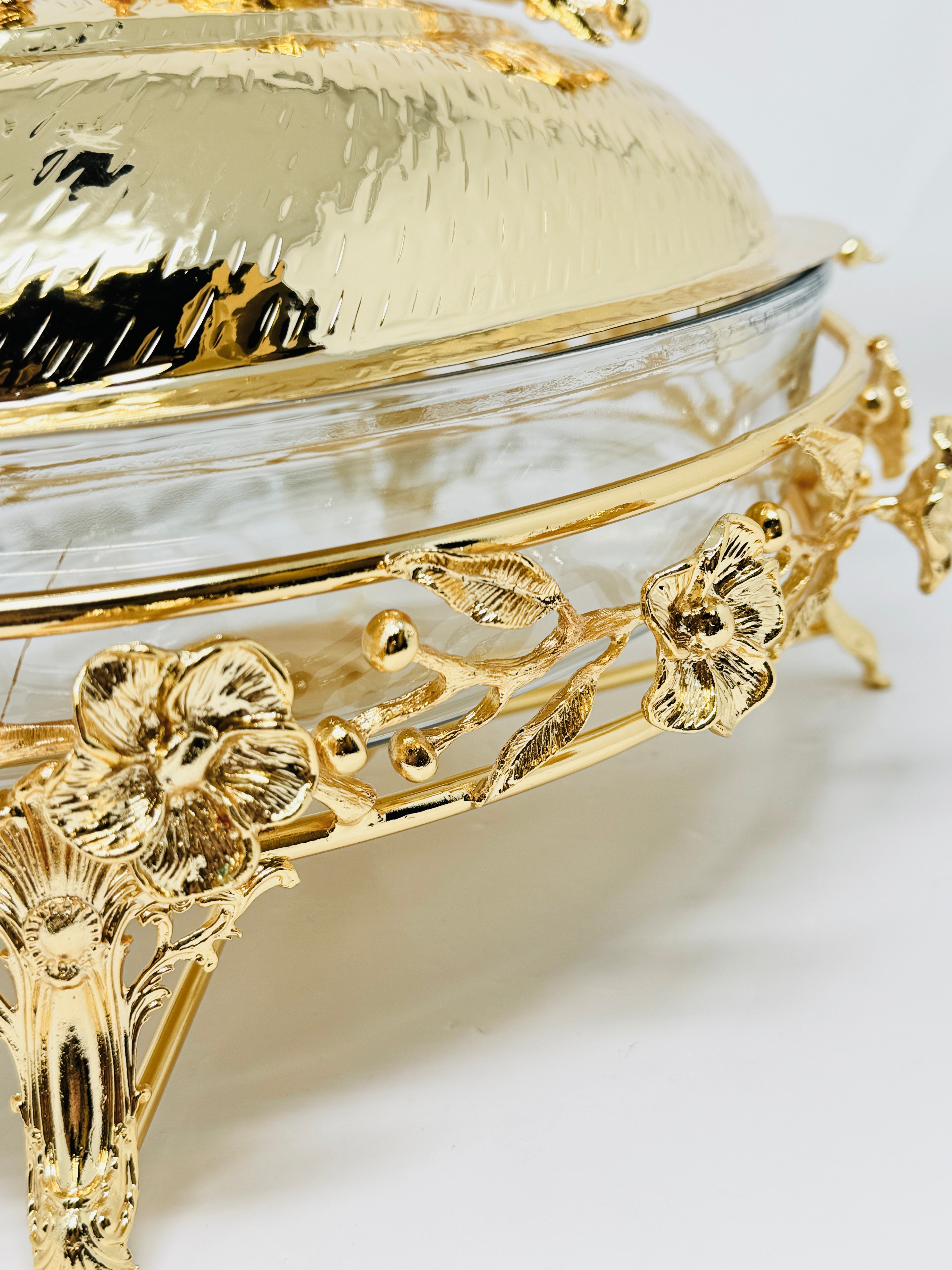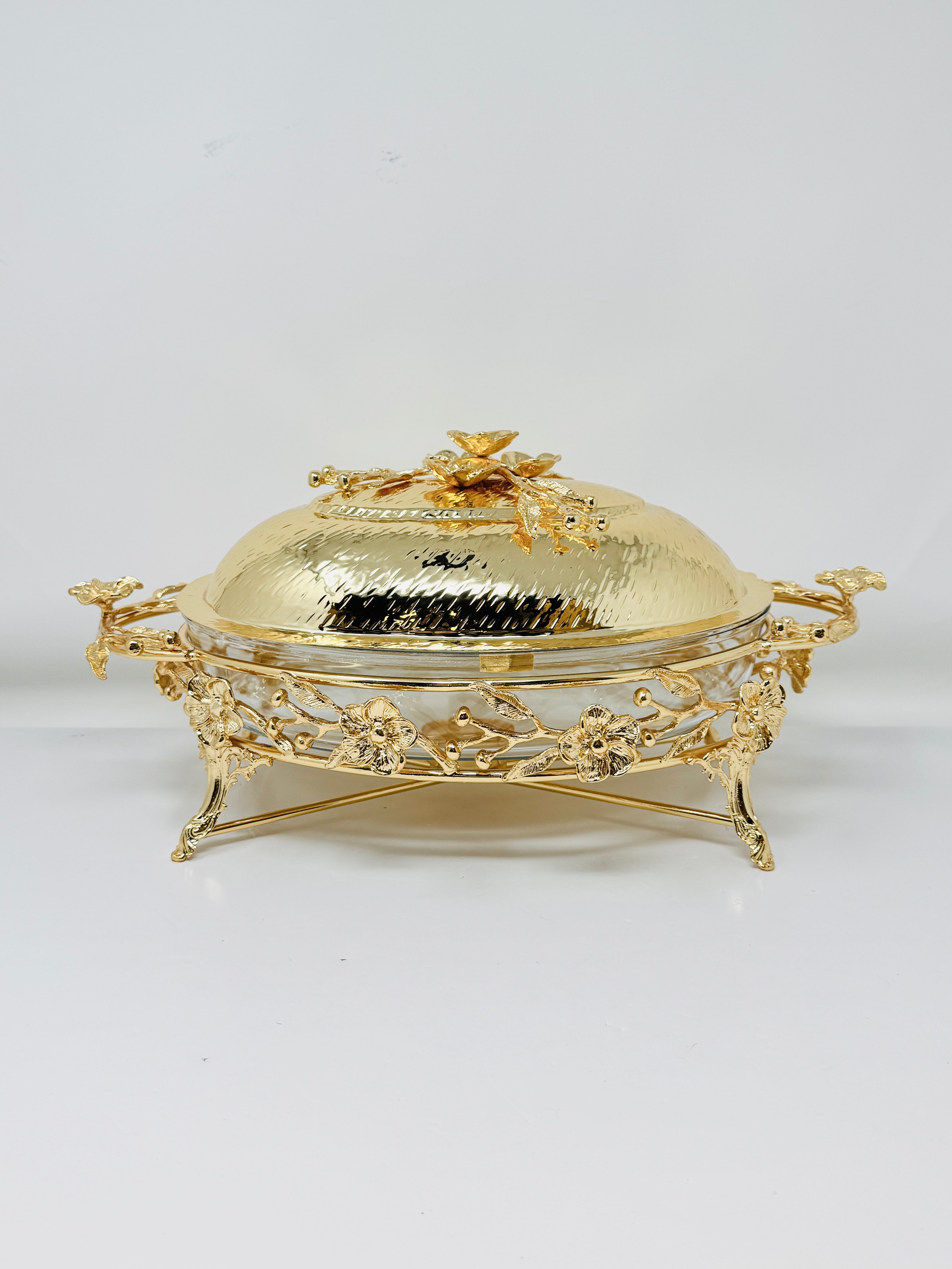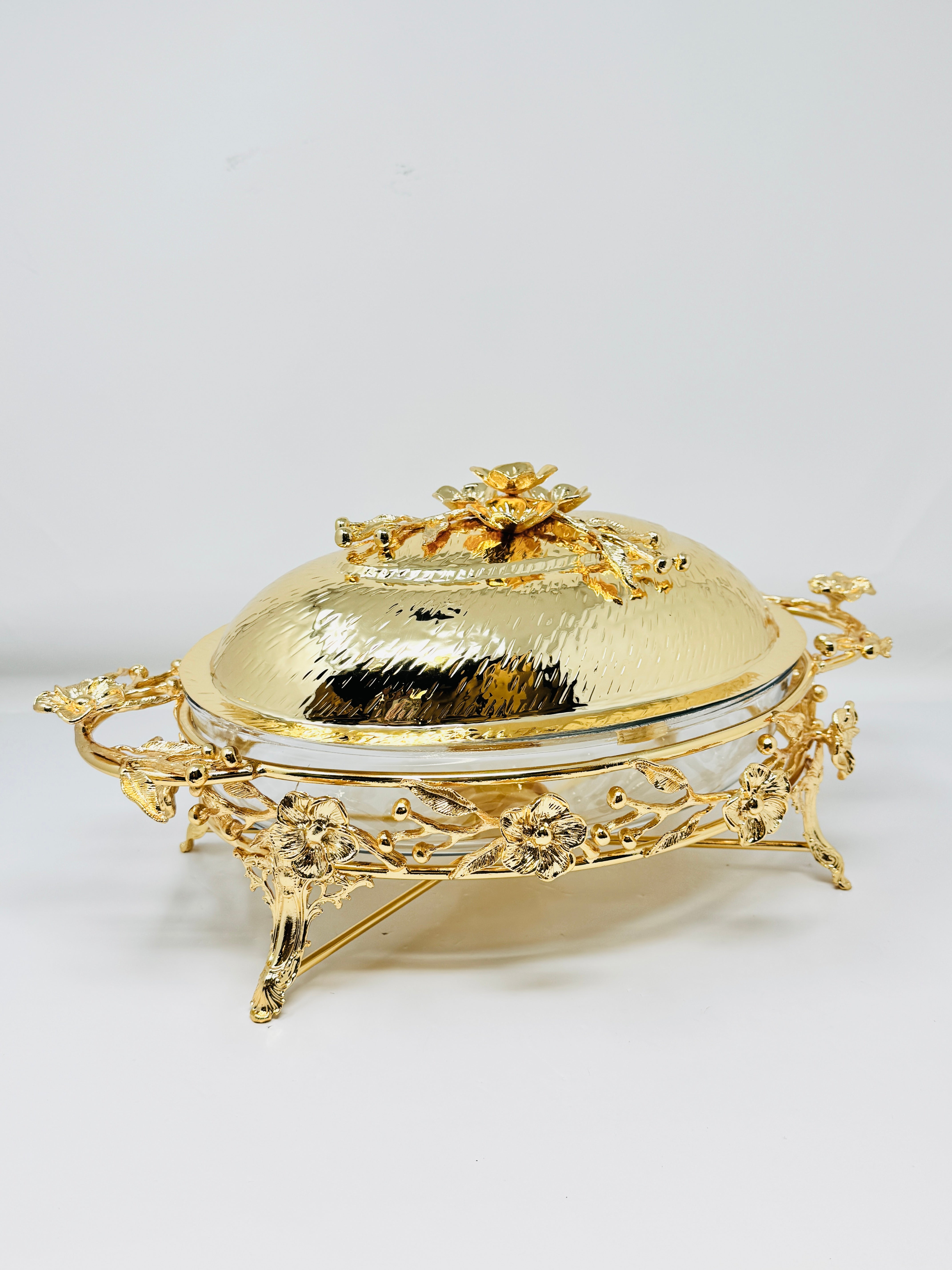 MEDIUM PYREX SERVING DISH STAND WITH WARMER AND FLOWER LID