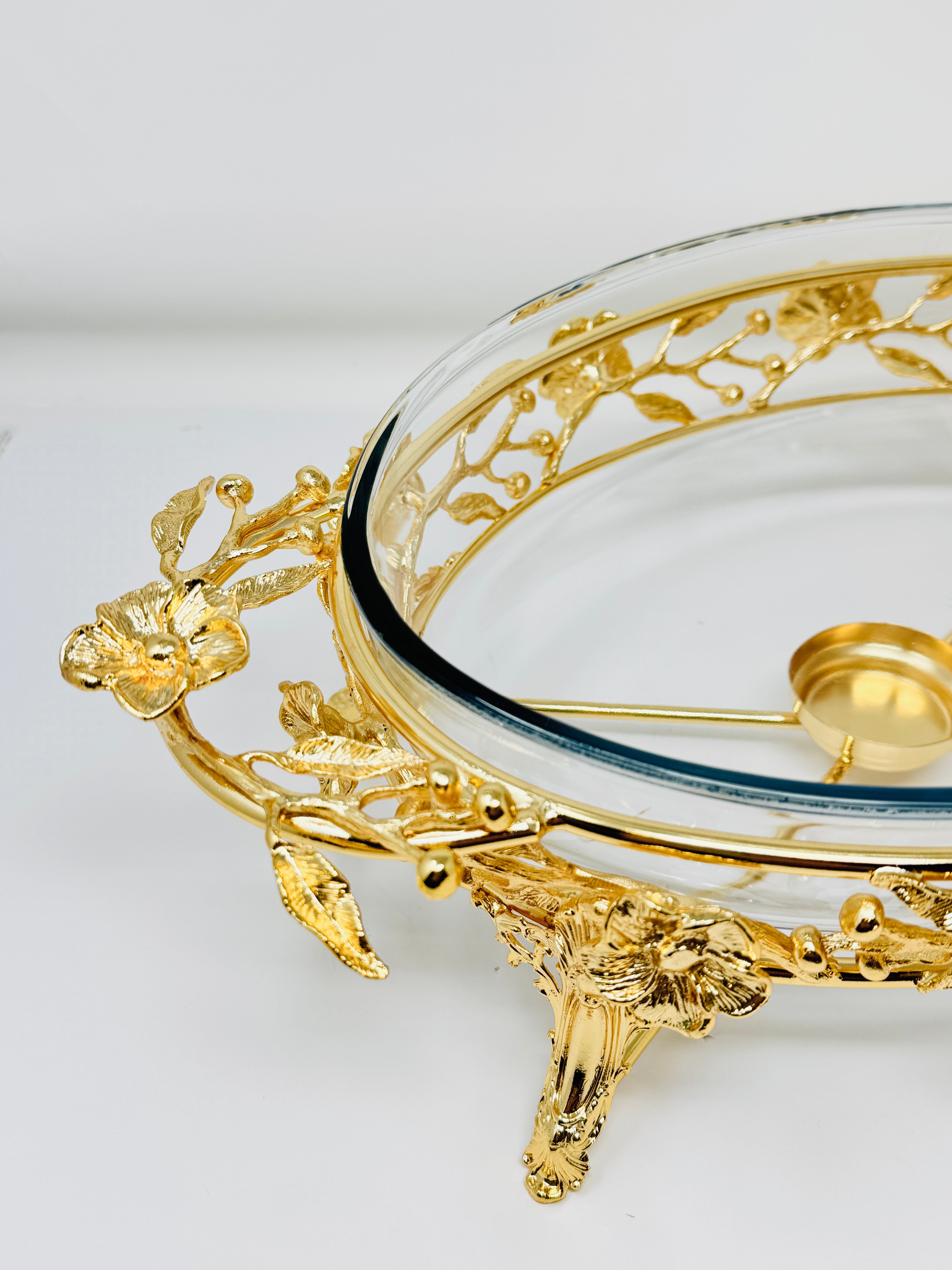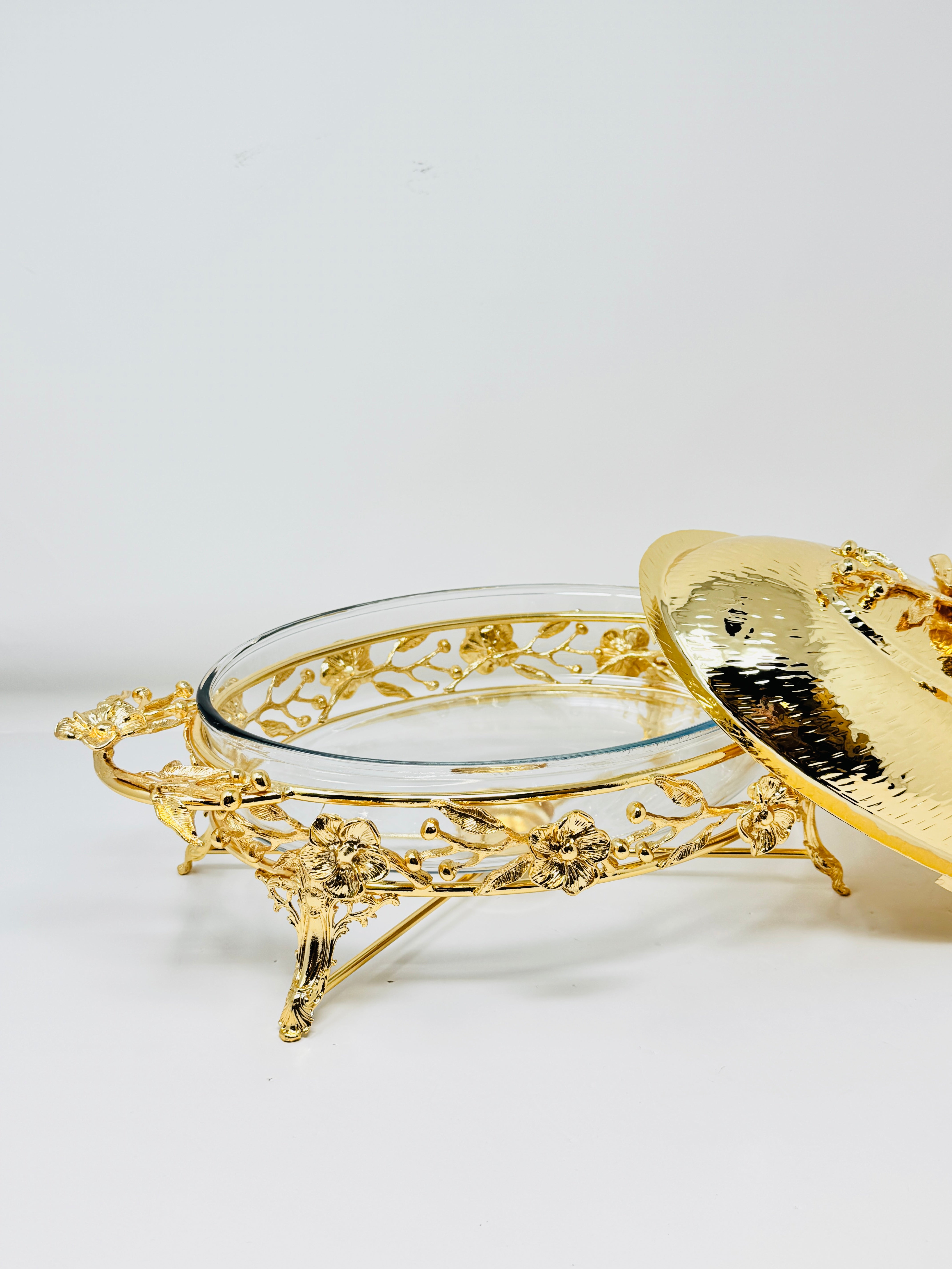 Add a beautiful piece to your collection with this Pyrex Serving Dish sat upon a Flower Branch Stand with a Warmer. This item is extremely convenient as the glass dish is removable and can be placed directly into the oven, and keeps the food warm once on the table. Convenience and class, a perfect combination for a successful dinner party.