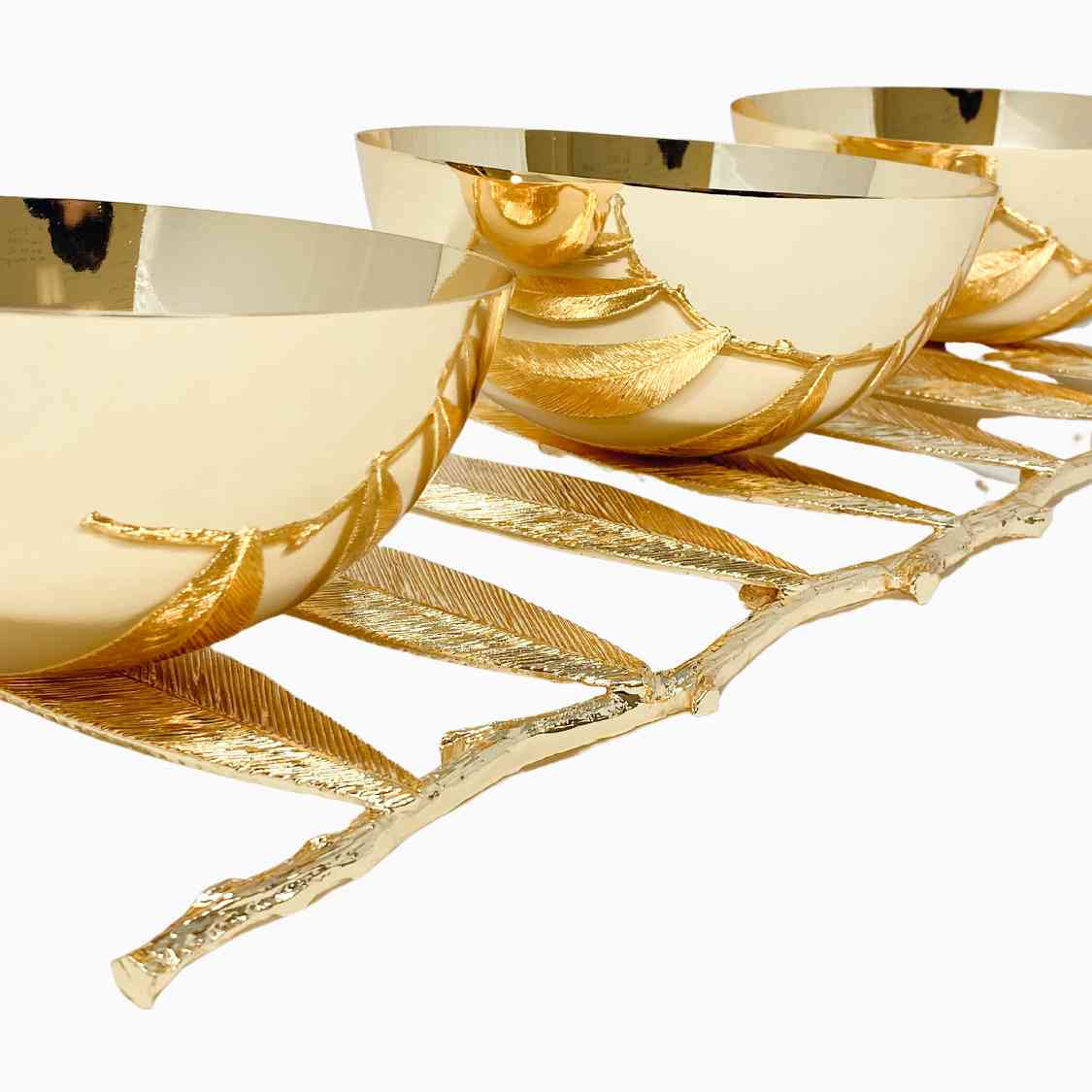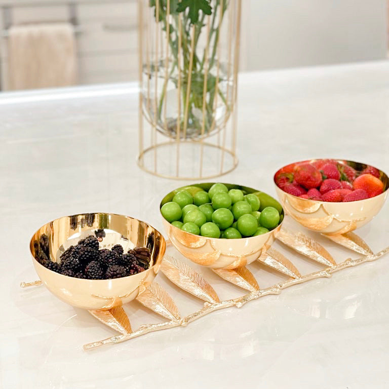 With its modern design, this three section snack bowl makes the perfect addition to any dinner party, ceremony or event.  Sat upon gold-embellished flat leaves, this piece is made to meet the needs of every guest. While some may prefer salty, others sweet or a combination of both, this three-section bowl provides enough space to leave all guests feeling full, happy and satisfied. This piece can also be used to decorate your kitchen counter, or serve as a key and jewelry holder.