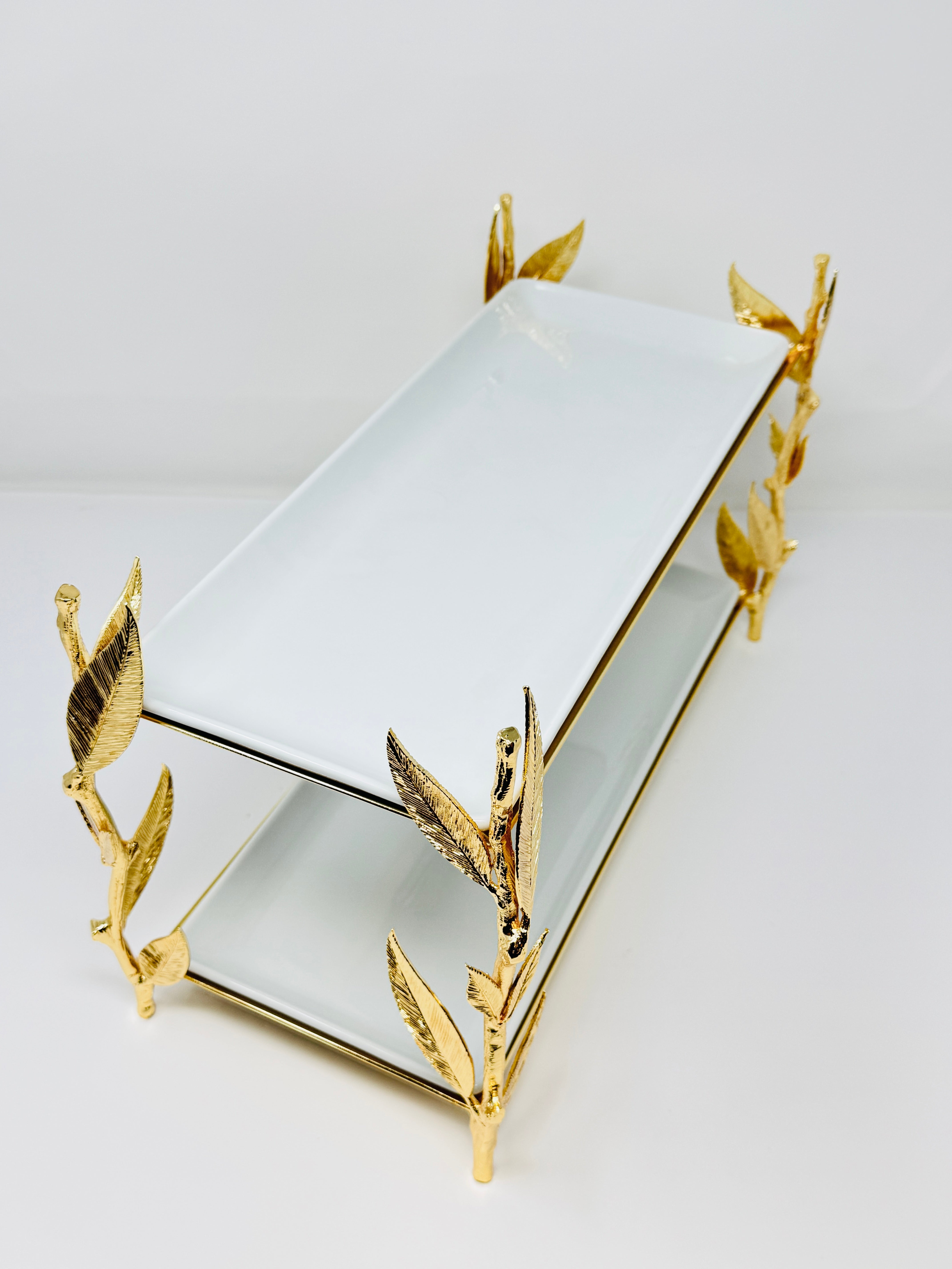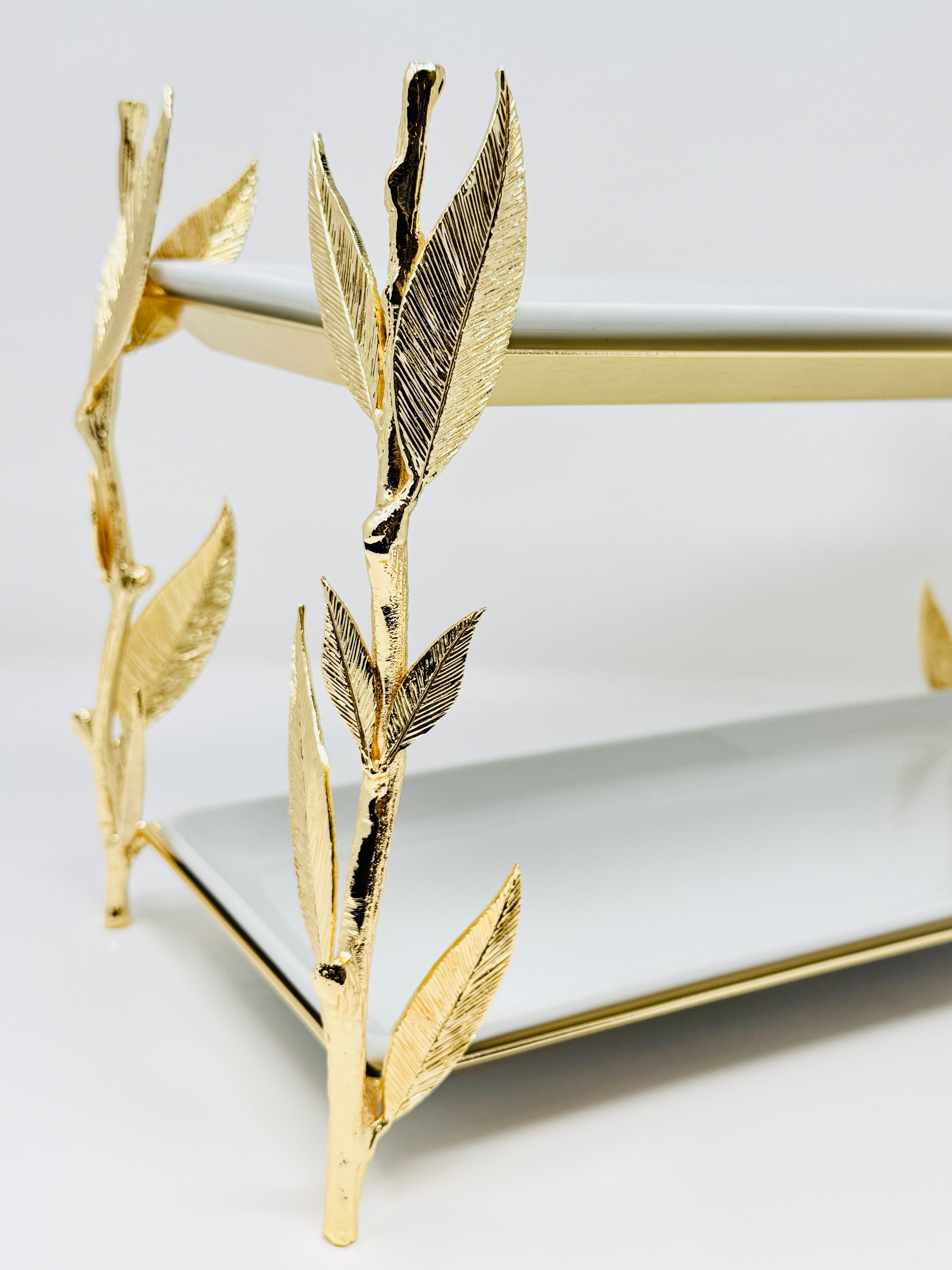 TWO TIER WHITE DESSERT PLATE ON GOLDEN TONE STAND, LEAF COLLECTION